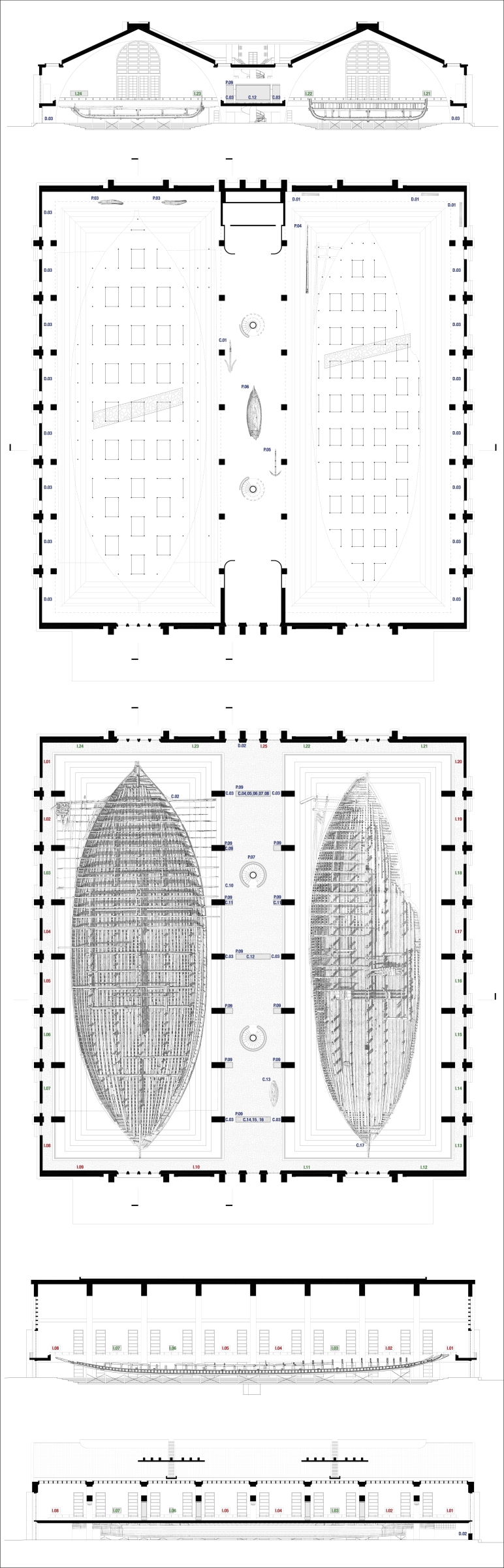 La simmetria compositiva delle navate gemelle è stata ulteriormente compromessa, non soltanto per le scelte museografiche – che hanno destinato una campata al racconto delle navi e l’altra a una narrazione del territorio non particolarmente incisiva – ma anche per le modifiche apportate alla spazialità architettonica. Oltre a predisporre l’inserimento di estese pedane poggiate sulle gradonate perimetrali e di tralicci aerei in metallo per gli impianti, che hanno contribuito a obliterare il rigore della spazialità degli invasi, si è deciso di proseguire lo scavo della via Virbia fino al limite perimetrale del museo: la continuità delle gradinate è stata interrotta e, in corrispondenza dei resti della strada, è stata creata una grande apertura vetrata, non coerente con il ritmo seriale delle aperture progettate da Morpurgo e molto distante dal linguaggio architettonico originario. In assenza dei grandi relitti, e di fronte a un nuovo allestimento poco efficace, i resti dell’antica strada hanno progressivamente assunto un ruolo sempre più prepotente, ancora oggi ben percepibile, senza di fatto riuscire a colmare il vuoto lasciato dall’incendio né a rinsaldare, sul piano visivo ed emotivo, il legame con il paesaggio storico.