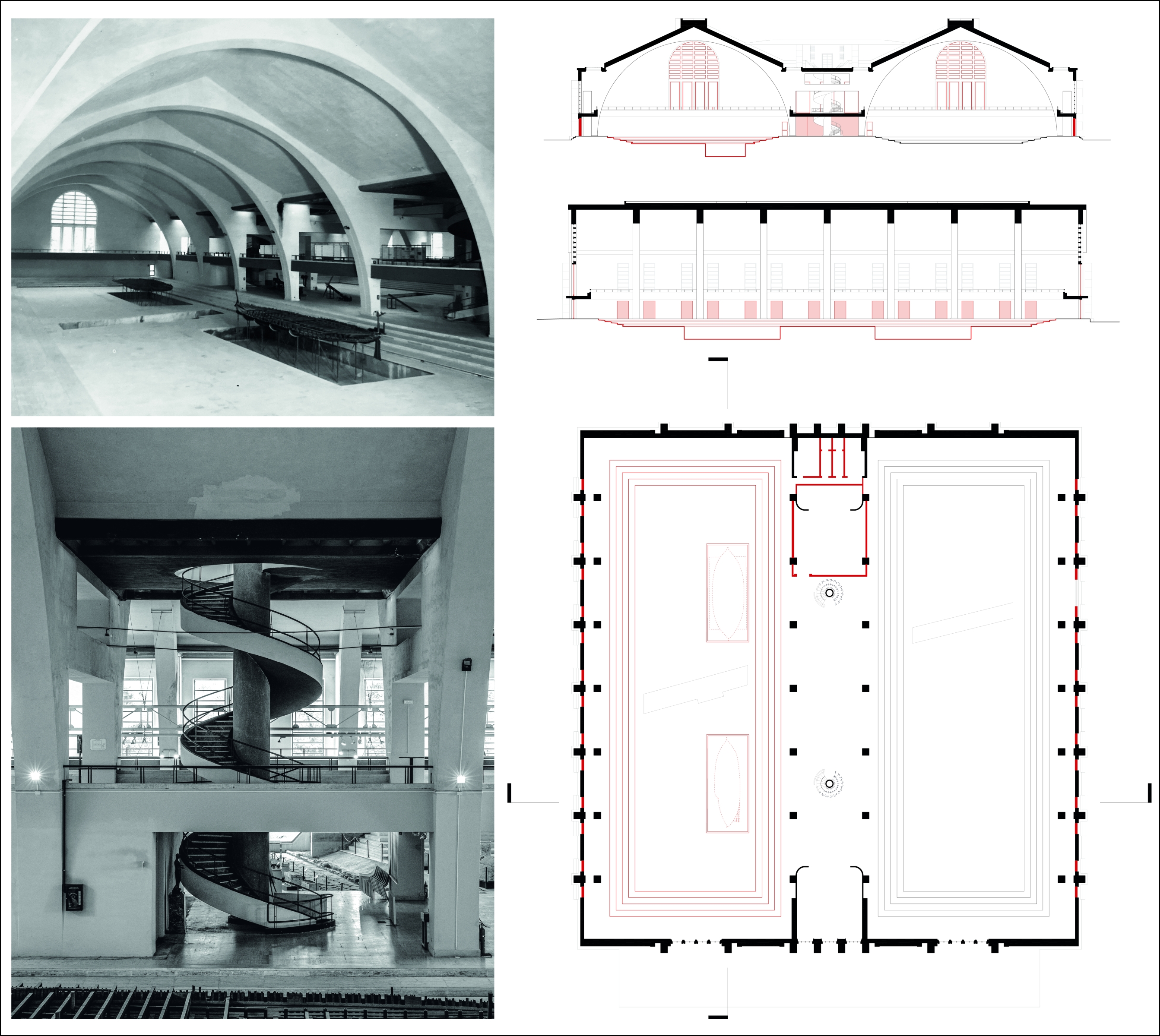 10 | Il museo dopo i lavori realizzati tra gli anni Sessanta e Ottanta: a sinistra, fotografia della campata sinistra con la riproduzione in legno in scala 1:5 dei relitti andati perduti e il corpo scala elicoidale con il magazzino di nuova costruzione; a destra, pianta e sezioni con, in rosso, le modifiche al progetto degli anni Quaranta (SABAP-MET-RM, Fondo Guido Ucelli; elaborazione grafica di I. Battilocchi, F. Casata, A. Incutti, P. Porretta) [clicca l’immagine per ingrandire].