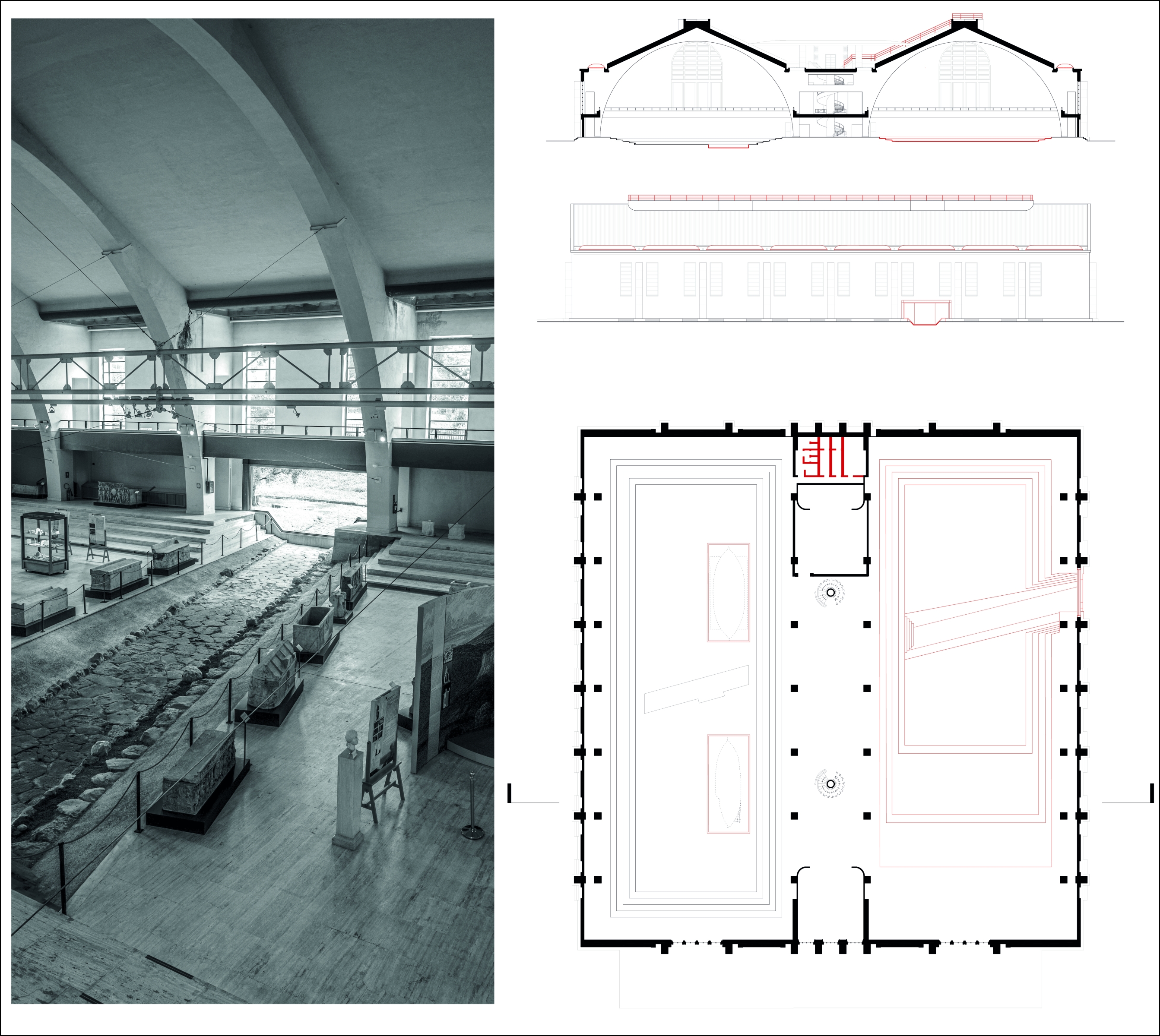 11 | Il museo dopo i lavori degli anni Duemila: a sinistra, fotografia della campata destra con la nuova sistemazione dell’invaso della via Virbia e, sullo sfondo, il finestrone aperto sul prospetto est; a destra; pianta e sezioni con, in rosso, le nuove trasformazioni (fotografia di Alban Lamy; elaborazione grafica di I. Battilocchi, F. Casata, A. Incutti, P. Porretta) [clicca l’immagine per ingrandire].