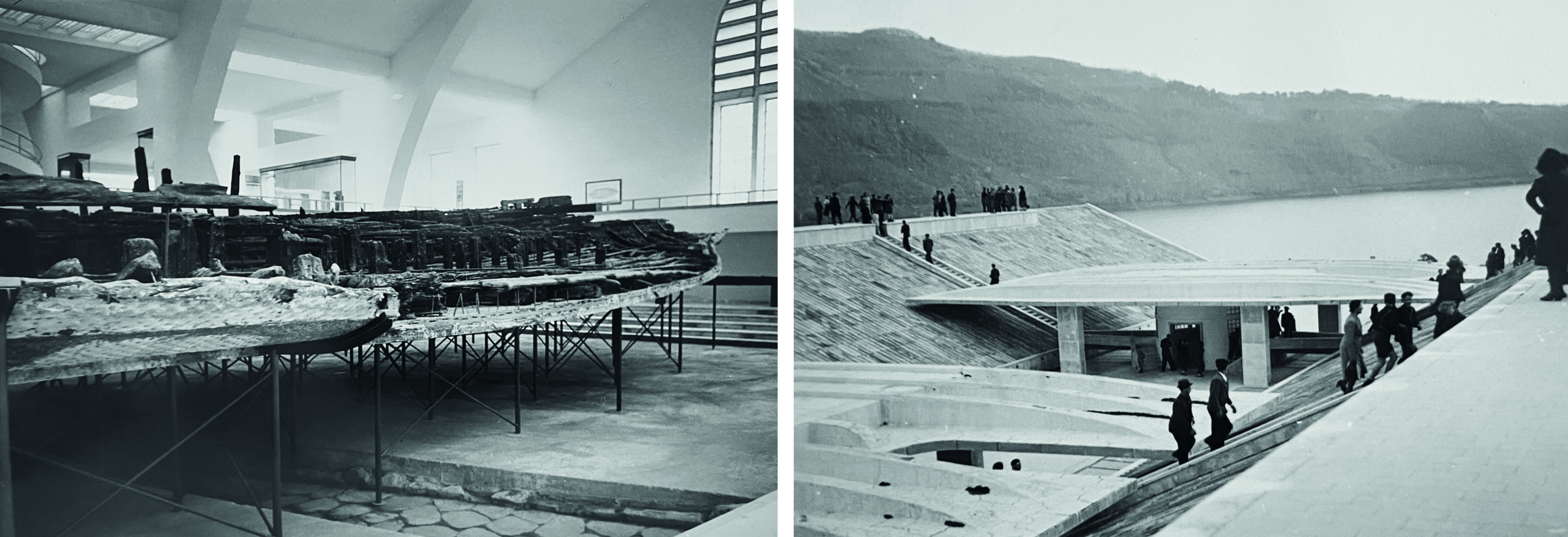 I lavori iniziarono immediatamente e nel 1940, alla presenza di Benito Mussolini e delle più alte autorità politiche italiane, il Museo delle Navi romane fu inaugurato: una grande teca costruita intorno ai relitti recuperati, un esempio straordinario di architettura progettata ex novo per esporre uno specifico contenuto archeologico nei pressi del suo ritrovamento e indubbiamente uno degli edifici più innovativi dal punto di vista museografico realizzati durante il Ventennio (Calandra di Roccolino, 2009-2010; Calandra di Roccolino 2024).