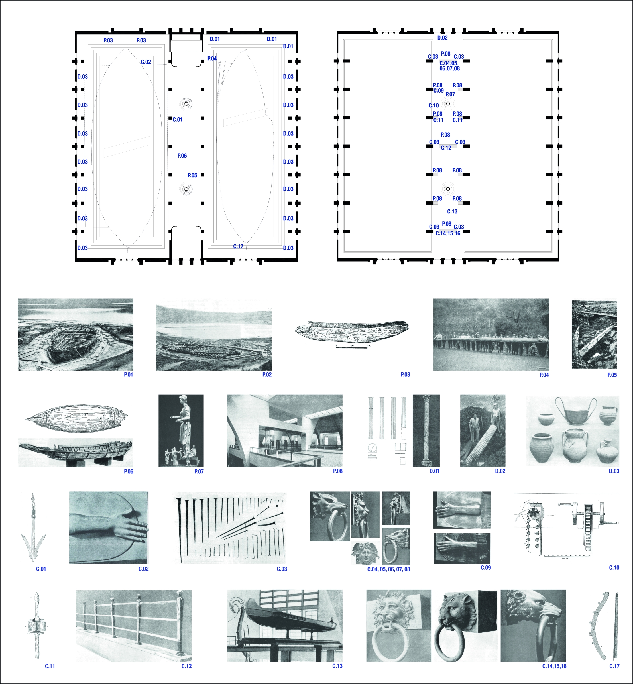 REPERTI ARCHEOLOGICI DISTRUTTI DALL’INCENDIO: P.01 – La prima nave; P.02 – La seconda nave; P.03 – Piroga recuperata dal fondo del lago (fig. 262, p. 233); P.04 – L’asse di un timone (fig. 71, p. 70); P.05 – Ancora in ferro con guaina in legno e ceppo smontabile scoperta il 20 maggio 1930 (fig. 269, p. 238); P.06 – Battello scoperto il 18 dicembre 1931 (figg. 266, 267 p. 235); P.07 – Statuette di pretesa provenienza del Lago di Nemi (fig. 225, p. 203); P.08 – Undici vetrine (tre grandi, otto piccole). Non è stato possibile individuare l’esatta collocazione dei resti dell’antica palizzata, andati perduti con l’incendio (fig. 116, p. 112; sui materiali andati perduti, pp. 307 e ss.).