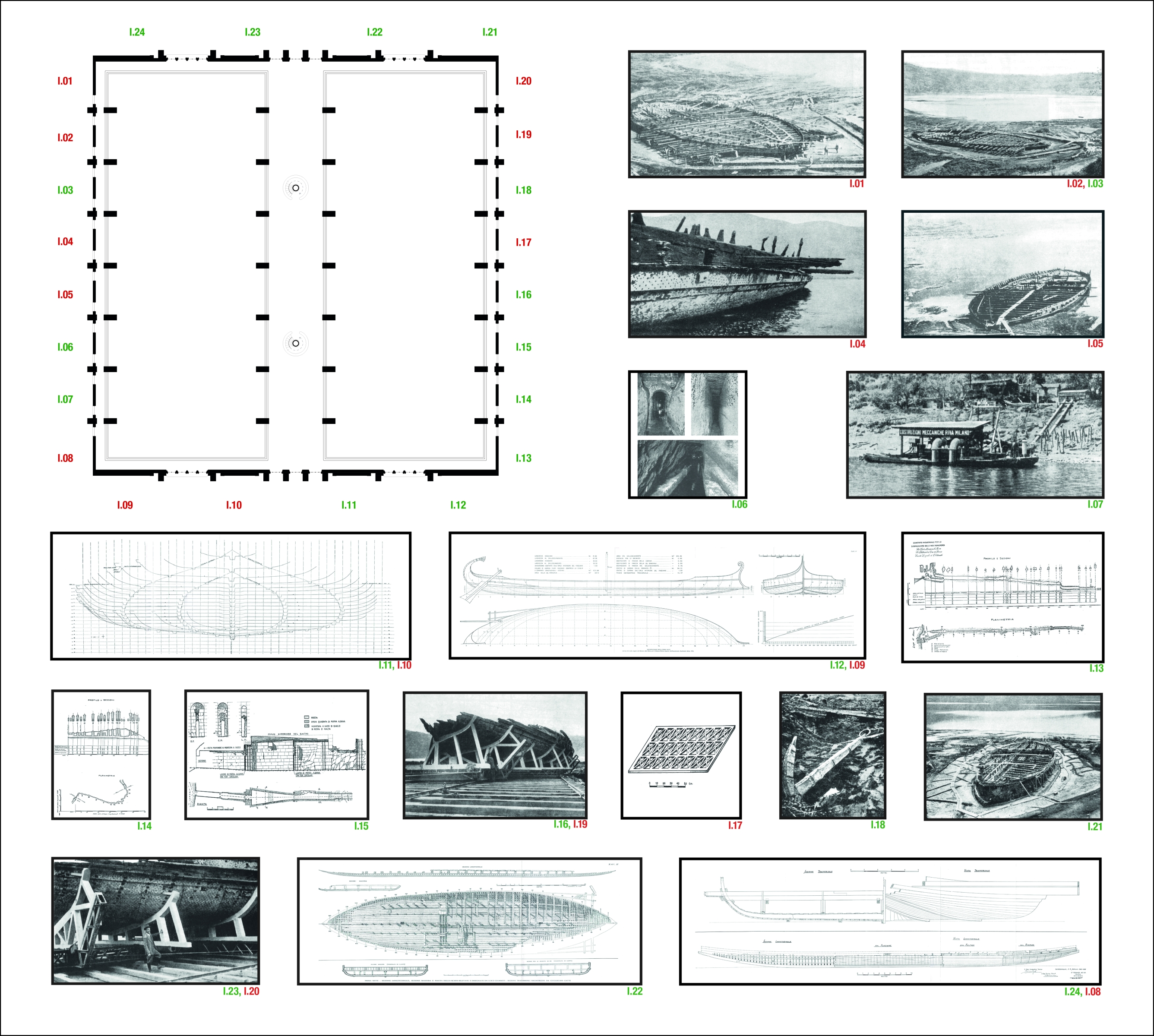 INGRANDIMENTI FOTOGRAFICI: I.01 – Prima nave – Sezione longitudinale, sezione maestra e pianta dello scafo rilevate e disegnate da Luigi Giammiti – Sezioni trasversali ricostruite da Gugliemo Gatti (Tav. II); I.02 – Seconda nave – Sezione longitudinale, sezione maestra e pianta dello scafo rilevate e disegnate da Gugliemo Gatti (Tav. II); I.03 – Ricostruzione della seconda nave; I.04 – Ricupero dell’ancora di legno con ceppo di piombo (fig. 275, p. 243); I.05 – La prima nave completamente emersa (fig. 75, p. 73). In rosso sono indicati gli ingrandimenti di cui non è stato possibile verificare i contenuti.