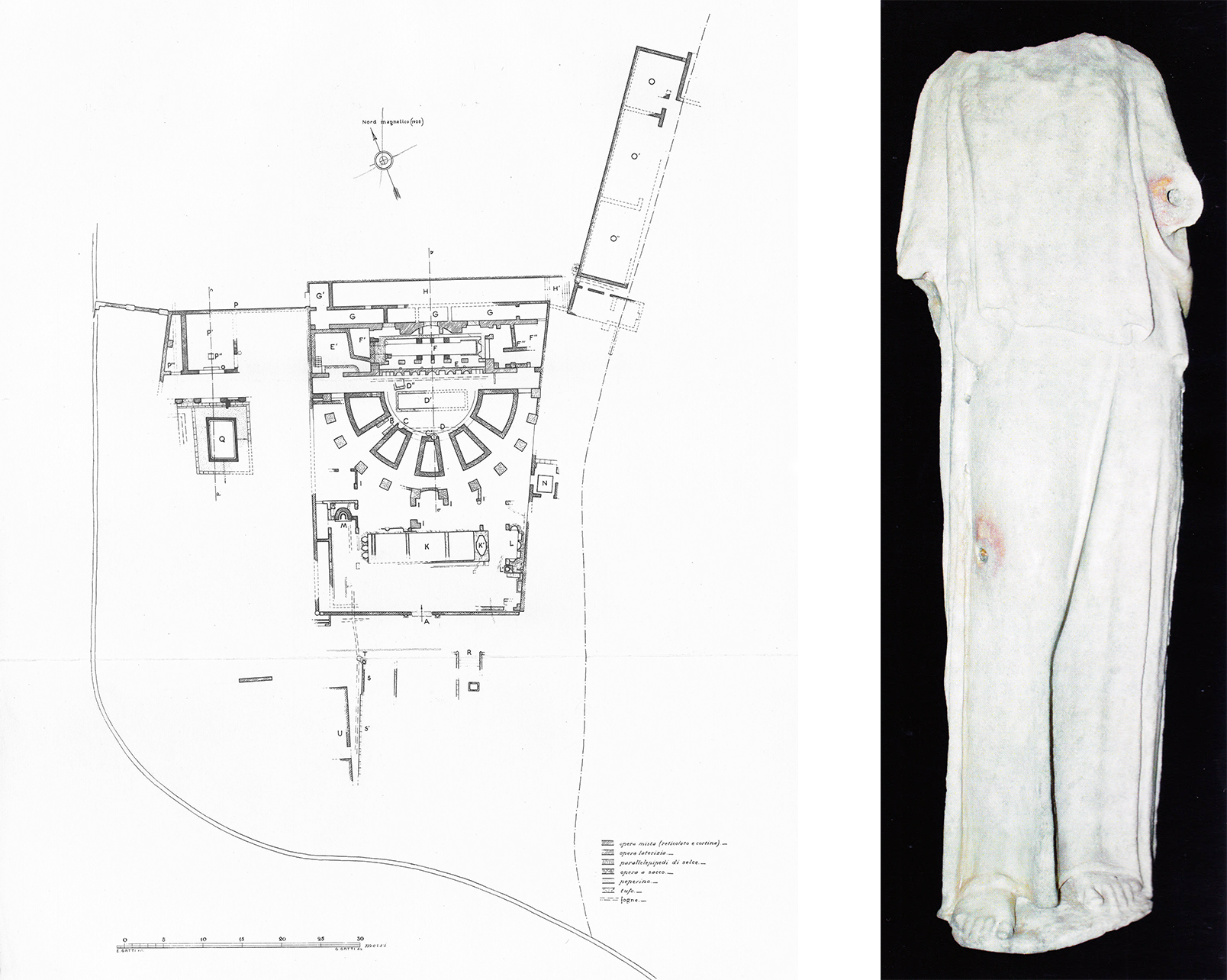 Secondo la lettura di Morpurgo e poi di Braconi, l’insieme di tali apprestamenti era funzionale allo svolgimento di rituali e di pratiche celebrative connesse a rappresentazioni sacre, in particolare per gli spettacoli legati al culto isiaco. Tale ipotesi è sostenuta sia da iscrizioni (in particolare da CIL XIV, 2216, con l’elenco degli oggetti preziosi deposti nei fana di Bubastide e Iside), sia da manufatti legati al culto della dea trovati nello spazio teatrale. Tra questi, interessante è la statuetta di fanciulla in marmo bianco, acefala, con funzione di portatrice di acqua, che doveva recare nella mano destra un’oinochoe appoggiata alla coscia destra (Filser 2013: [Fig. 6]). Potrebbe appartenere al medesimo tipo anche un’altra statuetta femminile in marmo grechetto, in posizione analoga, recuperata parimenti nell’area del teatro e interpretabile come una idrofora (Morpurgo 1931, 265-266, tav. IX). A est del teatro, in occasione dei medesimi scavi, sono stati trovati alcuni locali allineati rispetto a uno spazio scoperto, segnati in pianta con le lettere O, O’, O’’ [Fig. 5]: in base alla pianta elaborata da E. Gatti e poi pubblicata dalla Morpurgo, essi sembrano allineati e accessibili da est, forse da un’area scoperta, e presentano i lati corti di circa 6 m e quelli lunghi di misure variabili (O misura circa 6x8 m; O’ circa 6x15 m; O’’ circa 6x10 m). Al loro interno furono trovate alcune suspensurae, peraltro mal descritte, ed è quindi probabile che essi facessero parte di un settore riscaldato forse termale, per il quale la presenza dell’acqua doveva essere imprescindibile. Osservando la [Fig. 7, T], il loro diverso orientamento rispetto al teatro e, viceversa, il loro allineamento al settore del santuario, potrebbe suggerire, come già a Morpurgo, che queste stanze balneari risalgano alla fase tardorepubblicana durante la quale vi fu un ampliamento dello spazio sacro, che comportò la realizzazione delle terrazze con le celle donarie, nonché alcuni locali, forse per i sacerdoti o comunque per le attività sacre [Fig. 7, F].