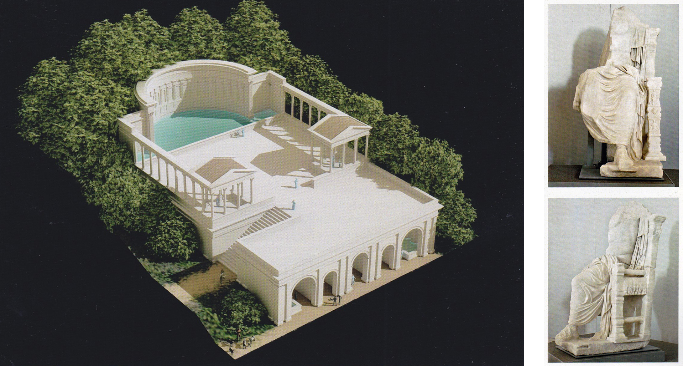 Il ninfeo era costituito da una vasca a forma di semicerchio allungato (o, secondo Giuseppina Ghini, di cavea teatrale-ventaglio: lungh. dell’arco 25 m), rivestita in cocciopesto per fini impermeabilizzanti e provvista di una fila di colonne in marmo sopra un basamento. Sul fondo campeggiava un podio entro cui fu collocata una statua monumentale in marmo di un personaggio maschile, secondo il tipo dello Zeus seduto in trono, che è forse da indentificare con lo stesso Caligola (Ghini, Palladino, Rossi 2016, 108-110: [Fig. 10]). La struttura doveva essere rivestita di marmi policromi, tessere vitree ed elementi utili a riprodurre l’interno di una grotta (pomici, murici e conchiglie) e a enfatizzare con il riverbero dell’acqua sulle pareti la figura in trono (vedi Ghini 2013, in particolare 214-215).