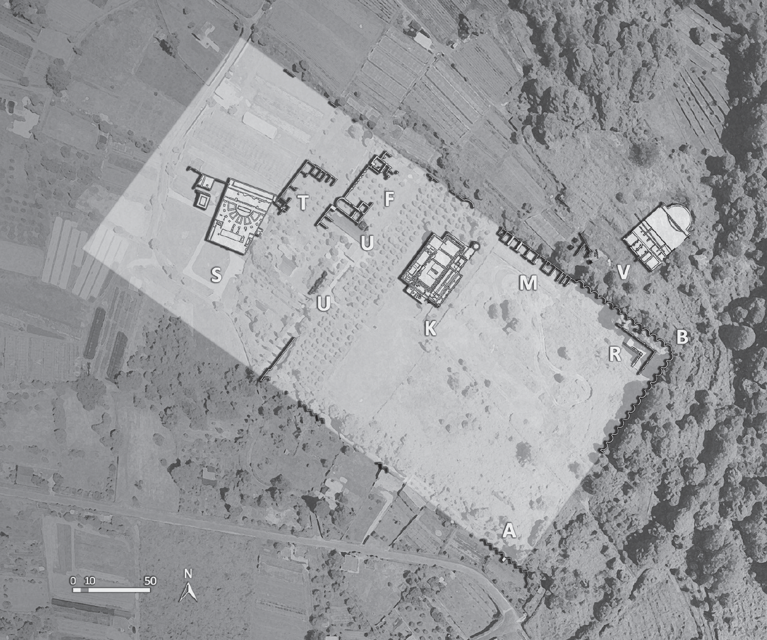 7 | Planimetria degli edifici presenti nell'area del santuario di Diana a Nemi. In senso antiorario dal basso: A, Terrazza inferiore; B, Nicchioni; R, Colonnato in opera incerta e mista; V, Ninfeo; M, Celle donarie; K, Tempio di Diana; U, cd. Case dei sacerdoti; T, Ambienti termali/impianto curativo?; S, Teatro (Diosono 2020, 24, fig. 2.7).