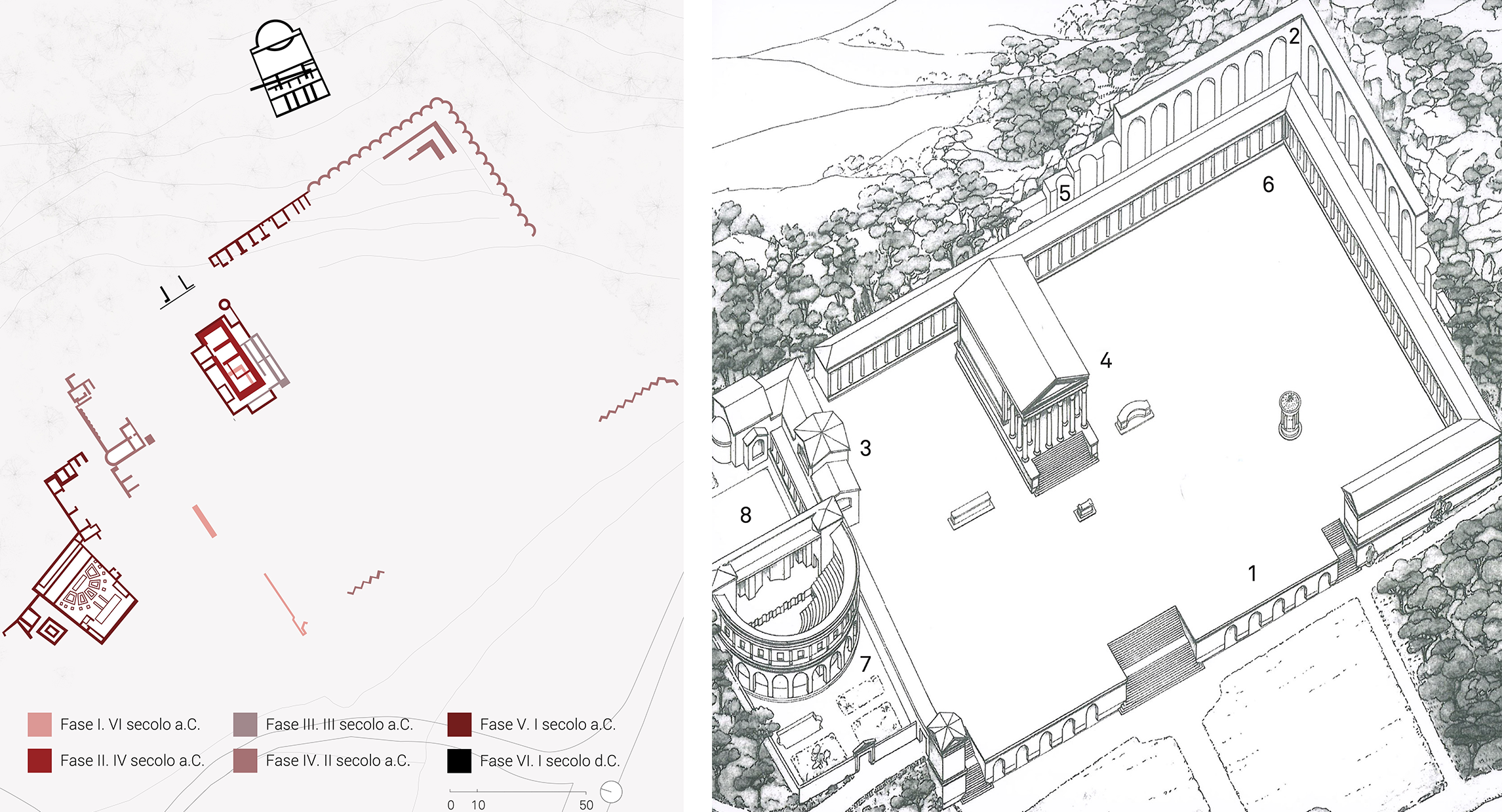 1 | Pianta del santuario con le fasi di costruzione aggiornata al 2013 (ridisegno di Beatrice Colombaro, da: Braconi et al. 2014, 18, Fig. 1).