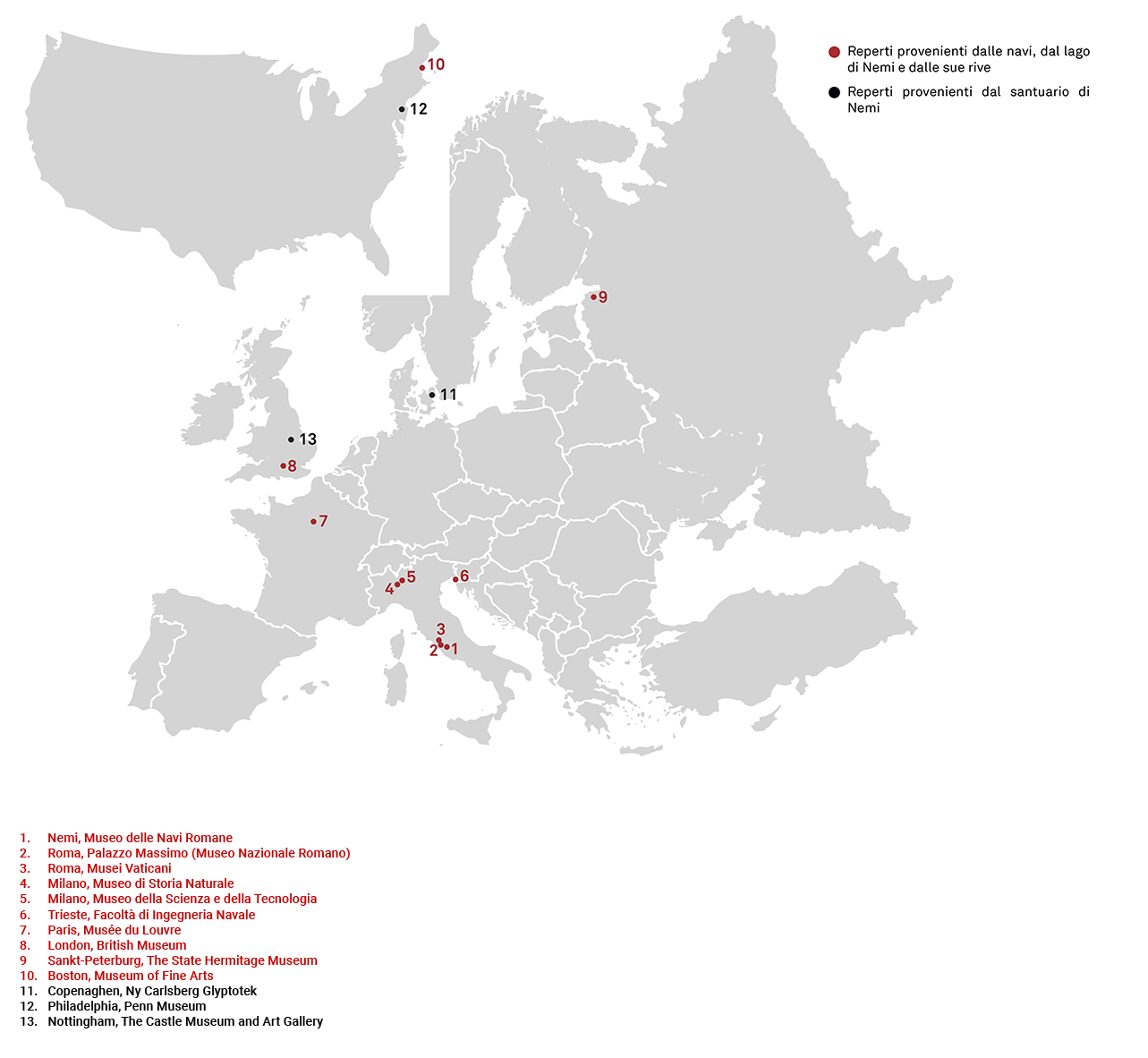 Alcuni reperti si trovano anche all’estero [Fig. 11, n. 7-9]: al British Museum di Londra è conservato un chiodo in bronzo, simile ai chiodi conservati nelle casse di legno a Nemi, ma anche un ex voto raffigurante Diana proveniente dal santuario. Dal lago provengono invece un simpulum al Musée du Louvre di Parigi e un ex voto raffigurante Eros all’Hermitage Museum di San Pietroburgo. Infine, si ha notizia anche di alcune statuette provenienti genericamente dal lago e conservate al Museum of Fine Arts di Boston [Fig. 11, n. 10]. In questo museo ci sono altresì molti oggetti provenienti dal Santuario di Diana, mentre altri esemplari sono conservati a Copenaghen, a Philadelphia e a Nottingham [Fig. 11, n. 11-13].