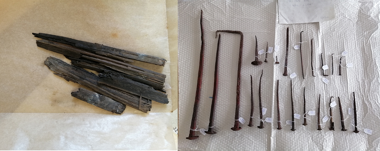 Gli scavi compiuti senza una visione d’insieme comportarono un’enorme perdita di manufatti, tra cui quelli in legno, che, com’è facile immaginare, costituiva il materiale prevalentemente utilizzato sui due scafi. Già dal Quattrocento le navi erano state intraviste sul fondo del lago: Leon Battista Alberti fu il primo a descriverne la struttura lignea (Alberti 1546, 103-105), seguito da Francesco De Marchi che riferì la presenza di stanze in cui si poteva entrare (De Marchi 1599, 42). Da queste prime prospezioni subacquee nei tre secoli successivi le navi subirono gravi danni per mano dei pescatori, che continuarono i saccheggi strappando legnami, lamiere di piombo, chiodi e tegole di rame (Casimiro da Roma 1845, 271).