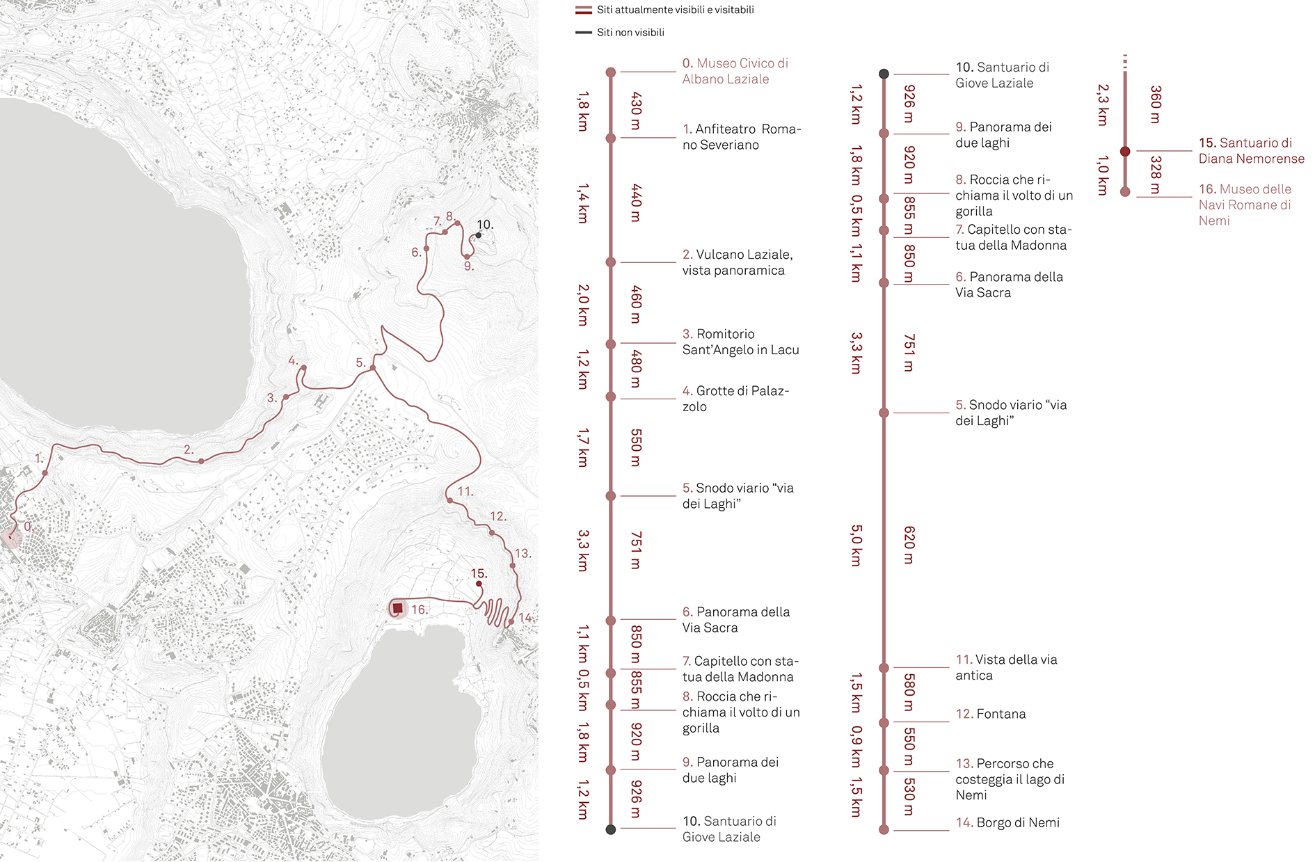 Il tragitto si basa sui due sentieri della via Francigena del Sud che costeggiano i bacini lacustri; il primo, lungo 14,86 km, che parte dalla via Ariccia di Albano Laziale e arriva quasi alla vetta del Monte Cavo, raggiungendo l’altezza massima di 925 m. Il secondo, di 15,06 km, prevede lo stesso punto di partenza e l’arrivo presso il borgo di Nemi, superando un dislivello di oltre 600 m. Rispetto ai due sentieri della Francigena, il nuovo percorso propone una variazione con l’obiettivo di unire due importanti luoghi di grande rilevanza storica: il Museo Civico di Albano Laziale e il Museo delle Navi romane a Nemi. Questo nuovo tragitto è concepito come un sentiero conoscitivo, da museo a museo e da santuario a santuario, consentendo ai visitatori di scoprire luoghi poco noti ma di grande valore archeologico, naturalistico e paesaggistico. Nell’itinerario sono stati previsti pannelli informativi e tappe strategiche corrispondenti a punti di interesse o viste panoramiche suggestive: scelte per la loro rilevanza storica, culturale e panoramica, esse offrono ai visitatori la possibilità di fare un’esperienza performativa. Partendo dal Museo Civico di Albano, che rappresenta il punto ideale data la sua posizione geografica, il visitatore può acquisire informazioni generali sulla storia dell'insediamento attraverso i materiali conservati al suo interno. Da lì il percorso si snoda lungo sentieri che offrono viste spettacolari sul lago di Albano, abbracciando con lo sguardo altri luoghi e borghi della zona attorno ai laghi di Albano e di Nemi. I visitatori giungono poi nei pressi del santuario di Giove Laziale sul Monte Cavo, il quale, trovandosi in zona militare, non è visitabile ma da quel punto il panorama è di grande suggestione [Fig. 5].