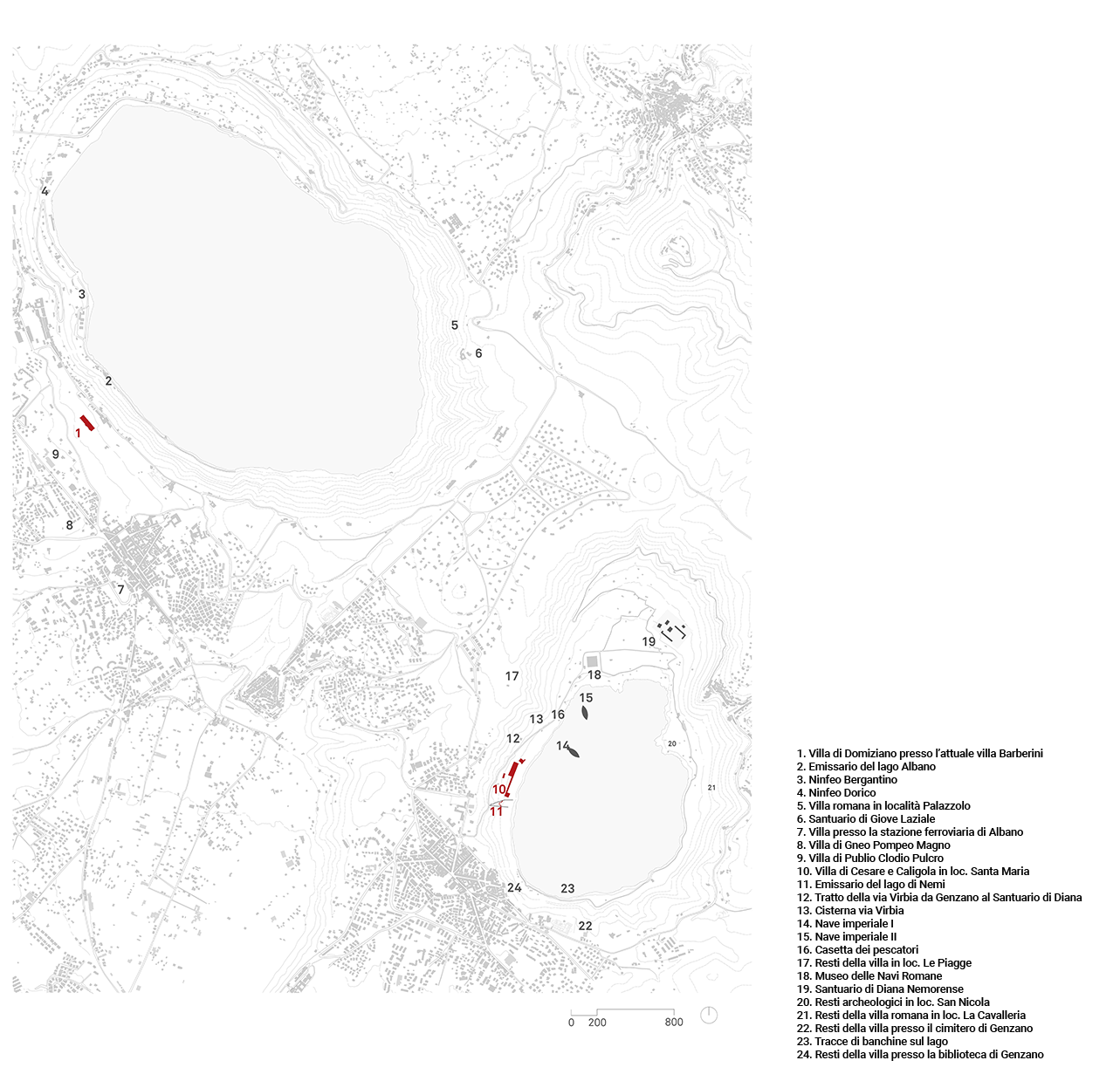 La presenza del santuario di Diana Nemorense sulla sponda settentrionale del lago, il rinvenimento delle navi imperiali nelle acque del lago e di numerose ville rendono questo contesto ricco di elementi interessanti dal punto di vista archeologico [Fig. 6].