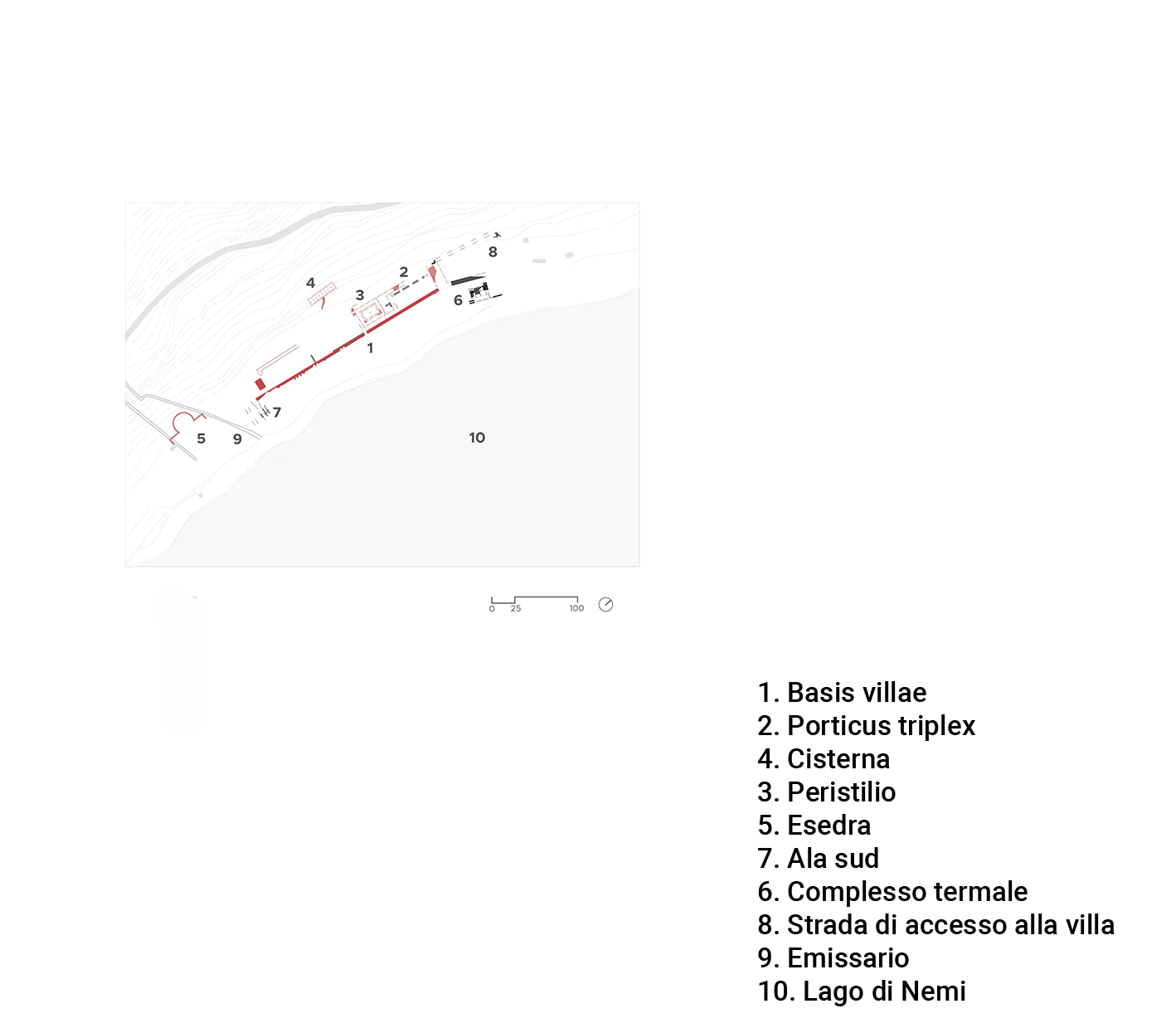 Tra le architetture private, quella di maggior importanza è venuta alla luce grazie agli scavi condotti dagli istituti di cultura danesi, finlandesi, norvegesi e svedesi tra il 1998 e il 2002, sul versante sud-occidentale del lago. Dall’analisi delle fonti scritte e di alcuni oggetti mobili, la villa in questione si attribuisce a Cesare e poi a Caligola, ma il periodo di uso e frequentazione si estende fino all’età adrianea [Fig. 7].