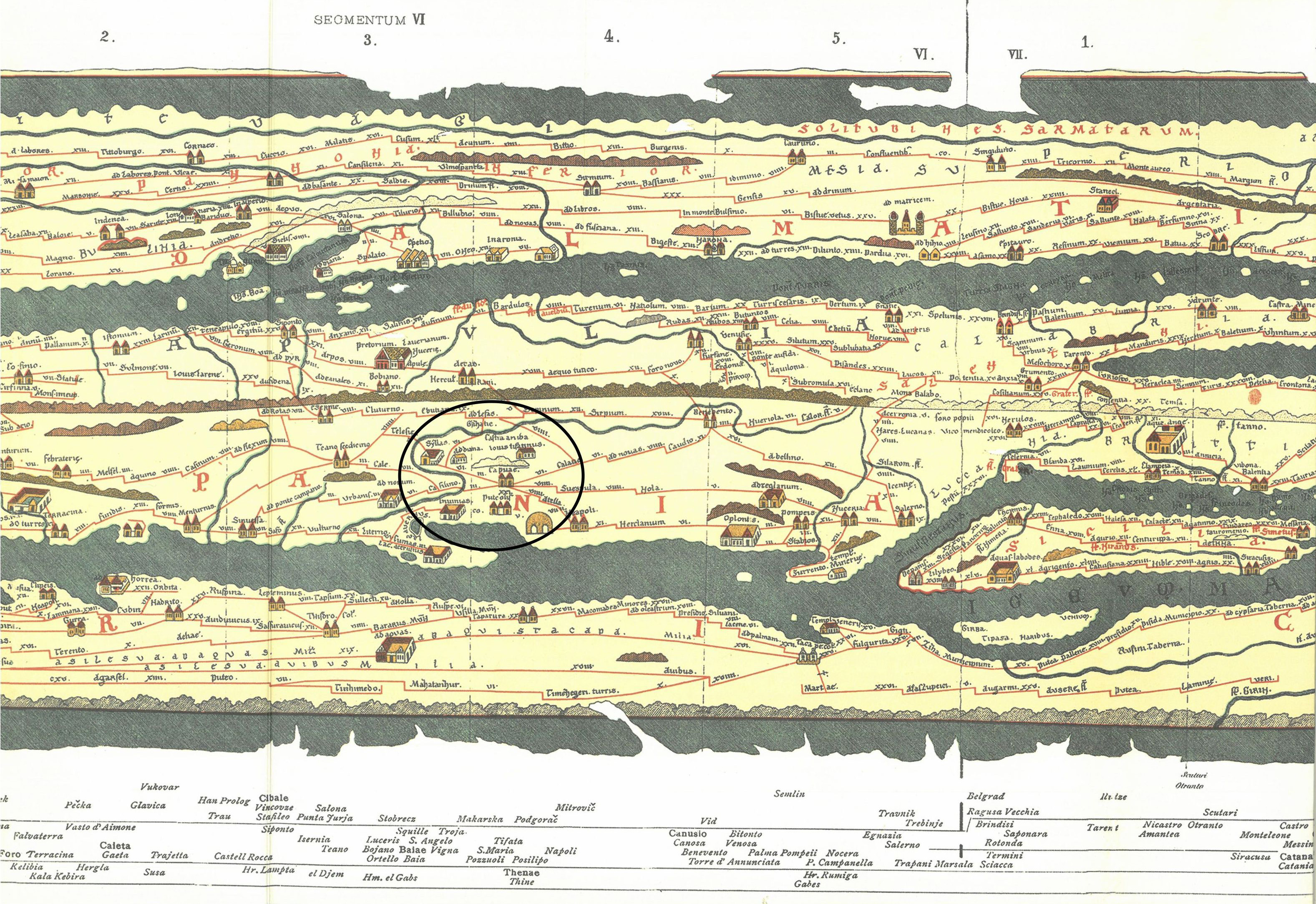 1 | The section of the Tabula Peutingeriana with the drawing of the possible healing building (Syllas) attributed to the springs of Monte Tifata and the Sanctuary of Diana Tifatina near Capua (Tab. Peut. segm. V, 3: ©www.omnesviae.org).
