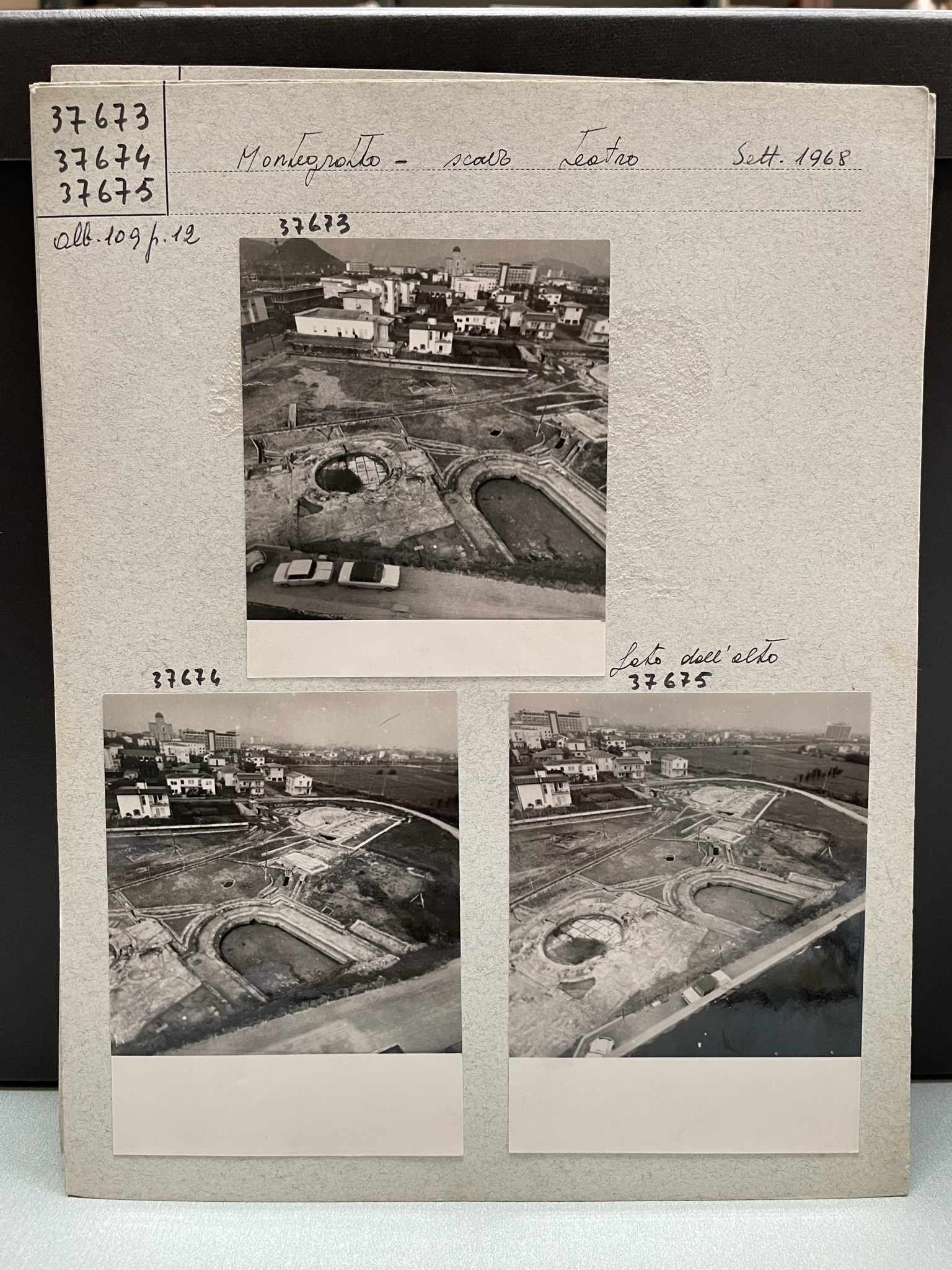 2 | Superintendency of Padua, aerial view of the Via Scavi archaeological site, Montegrotto Terme, 1968. SABAP Padua, photographic archive ALB.109-p.12, nos. 37674 and 37675_a. The image shows the Roman thermal complex, highlighting the arrangement of pools, the theatre/odeum, and surrounding structures, serving as a key reference for later excavations and conservation interventions (Bonomi, Malacrino 2012; Bassani 2022).