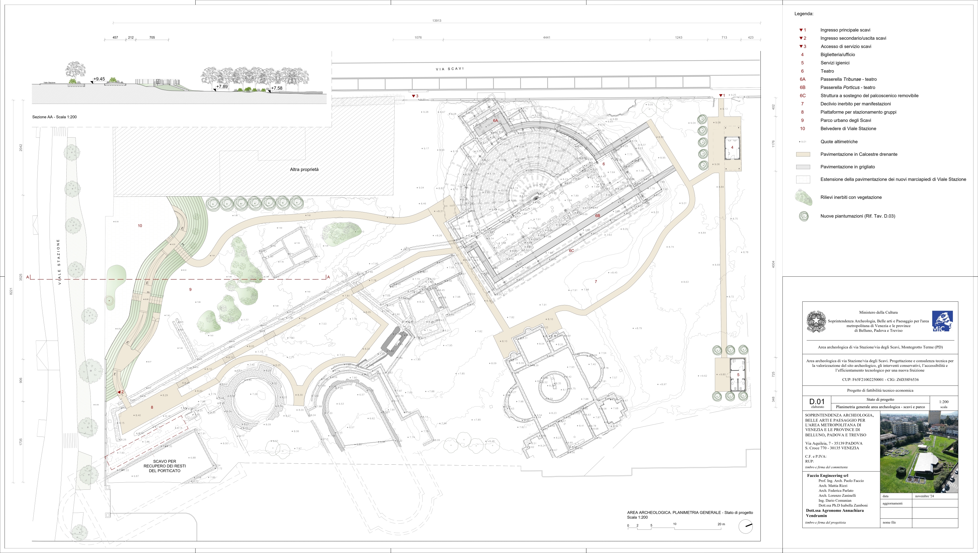 4 | Superintendency of Padua, definitive project for the Via Scavi archaeological area, Contract Rep. 322/2022, 2022. SABAP Padua works archive. The project highlights the north-western square as a welcoming hub and the south-western entrance with views from Viale della Stazione and a green space for visitors, alongside internal paths, the theatre/odeum, and the thermal structures.