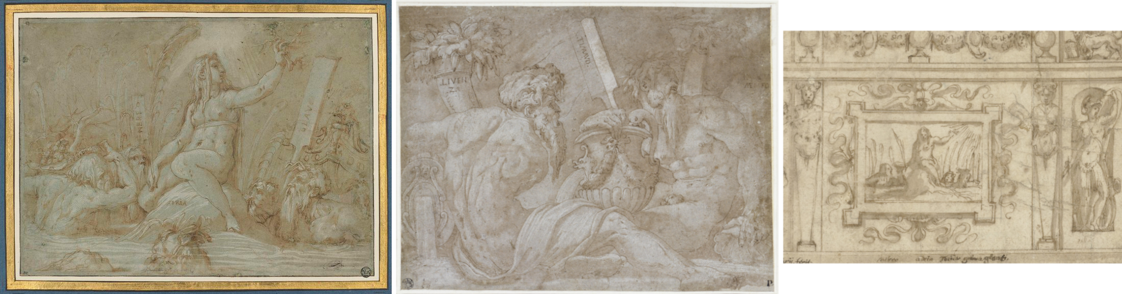 5 |Giorgio Vasari (attribuito a), Tre divinità fluviali, penna in marrone, lavata e accentuata in bianco, su carta blu, 1541-1542, Berlin, Staatliche Museen, Kupferstichkabinett [Inv. KdZ. 15260]. Credit: Staatliche Museen zu Berlin, Kupferstichkabinett / Jörg P. Anders. Dominio Pubblico.