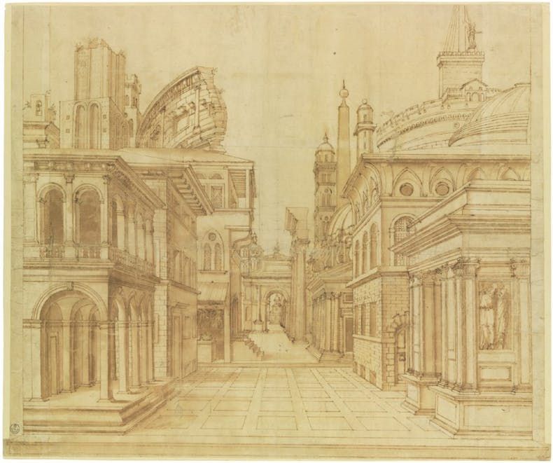 6 | Giorgio Vasari, Progetto per la scenografia de La Talanta di Aretino, penna e pennello in inchiostro bruno su carta, 1541-1542, Amsterdam, Rijksmuseum [Inv. RP-T-1958-42]. © Acquistato con il supporto del F.G. Waller-Fonds. Dominio Pubblico.