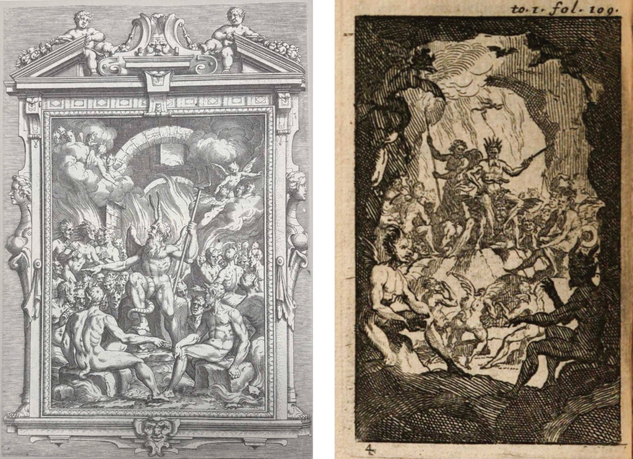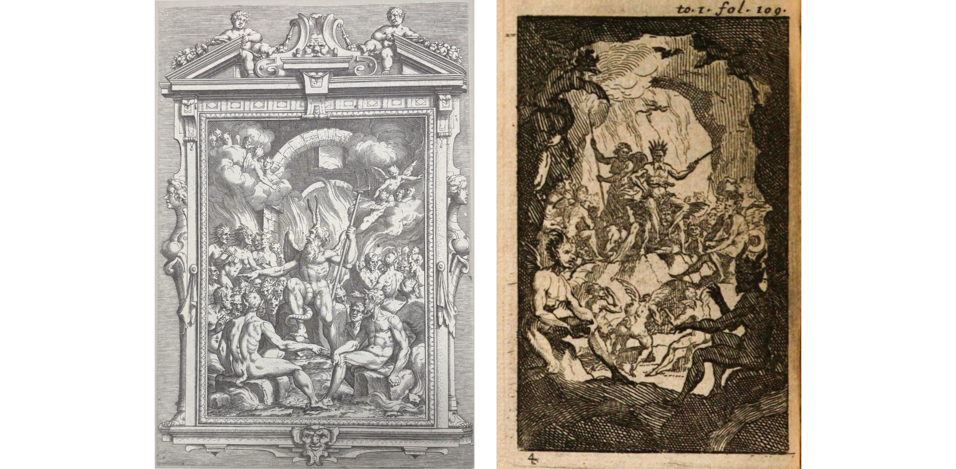 Al di là di alcuni cambiamenti nell’iconografia di Plutone tra i versi, l’illustrazione in Pavoni 1617 e quella di Elsevier 1678, ancora una volta in quest’ultimo caso la raffigurazione dell’intera campata e il gioco di luci amplificano lo spazio nonostante le ristrette dimensioni del 24°, e ci danno l’impressione di essere sulla soglia di una scena che il diavolo all’estrema destra ci invita a guardare come se fossimo a teatro [Figg. 13-14]. È proprio in virtù dell’importanza della dimensione scopica che si registrano forse le illustrazioni più belle di Leclerc, nelle quali – come di consueto – rappresenta il momento già prescelto dal Castello, apportando però modifiche non indifferenti che aggiungono, anziché sottrarre, forza al medium visivo.