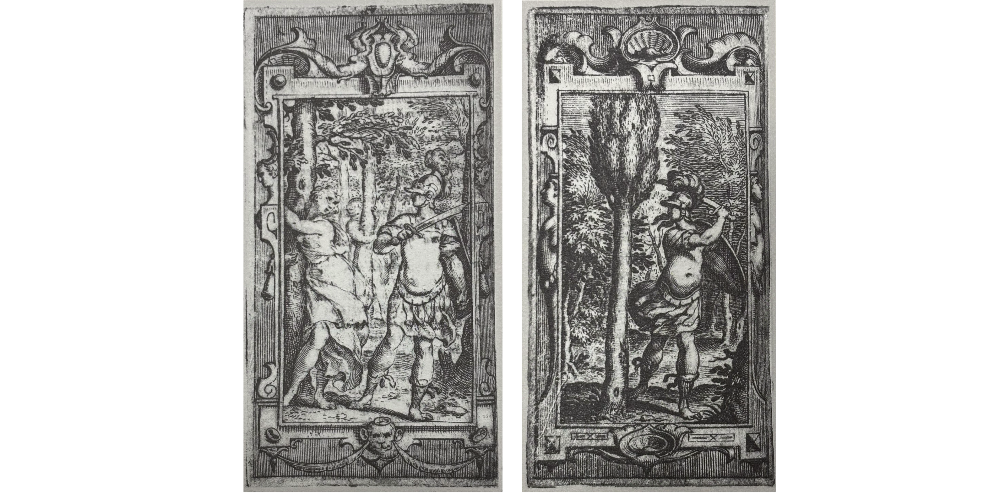 Che il canto III e il canto XIII della Gerusalemme propongano schemi iconografici simili è un dato evidente e non è insolito ritrovare nella tradizione illustrata dittici di incisioni simili tra loro. Nel caso delle incisioni di Leclerc, l’edizione veneziana per Domenico Lovisa (1685) scambia per esempio le due illustrazioni esaminate, proponendo erroneamente il cavaliere del canto XIII per il canto III e, viceversa, il crociato del III per quello del XIII. Anche qualora la scelta figurativa sia ricaduta altrove, non si è esente da errori: uno dei dittici più diffusi è la rappresentazione di Tancredi nella selva per il canto XIII e di Rinaldo nella medesima foresta per il canto XVIII. Prendiamo in esame la prima edizione che propone questa ‘coppia’, con il solito Castello stavolta però nella versione del 1604 (Pavoni 1604), replicata nell’edizione Sforzini 1618 e dunque, nel supposto Leclerc del 1674 per l’Hercole: ci sembra innegabile che in quest’occasione le due illustrazioni siano state scambiate in sede di stampa, a partire dall’edizione Pavoni 1604 e perpetuando l’errore nelle successive del 1618 e del 1674. Almeno un paio di elementi suffragano questa ipotesi: in primis, osservando le piante opposte ai cavalieri, è evidente che quello nell’edizione Pavoni 1604 al canto XIII è un cipresso [Fig. 19], mentre quello per il canto XVIII è più simile al mirto [Fig. 20]. Come è noto, è Tancredi a trovarsi davanti al cipresso (Lib. XIII, 38) – pianta funeraria per eccellenza – mentre a Rinaldo si palesa un mirto (Lib. XVIII, 25); se poi si raffronta l’apparizione rispettivamente della falsa Clorinda e della falsa Armida, è chiaro che quest’ultima corrisponde alla nostra figura 19, quando di fronte a Rinaldo che “stringe il ferro ignudo” (Lib. XVIII, 33, 8) ella “vassene al mirto; allor colei s’abbraccia / al caro tronco, e s’interpone e grida” (Lib. XVIII, 34, 1-2); inoltre, mentre ‘Clorinda’ compare da sola agli occhi di Tancredi [Fig. 20], dinanzi a Rinaldo, prima ancora dell’apparizione di ‘Armida’, spuntano “insieme poi cento altre piante / cento nife produr dal seno pregnante” (Lib. XVIII, 26), ed è nella sola figura 19 che compare più di una persona tra le piante. La confusione non si crea invece nell’edizione Andreoli 1670 – le cui illustrazioni di Clouwet vengono riprese nell’edizione Quartaroli 1678 – perché qui, a fronte di un Rinaldo che continua ad alzare la spada verso l’albero antropomorfo per il canto XVIII, per il canto XIII si sceglie di rappresentare la pioggia finalmente inviata da Dio che rinnova le speranze dei crociati, raffigurati proprio come descritti da Tasso: