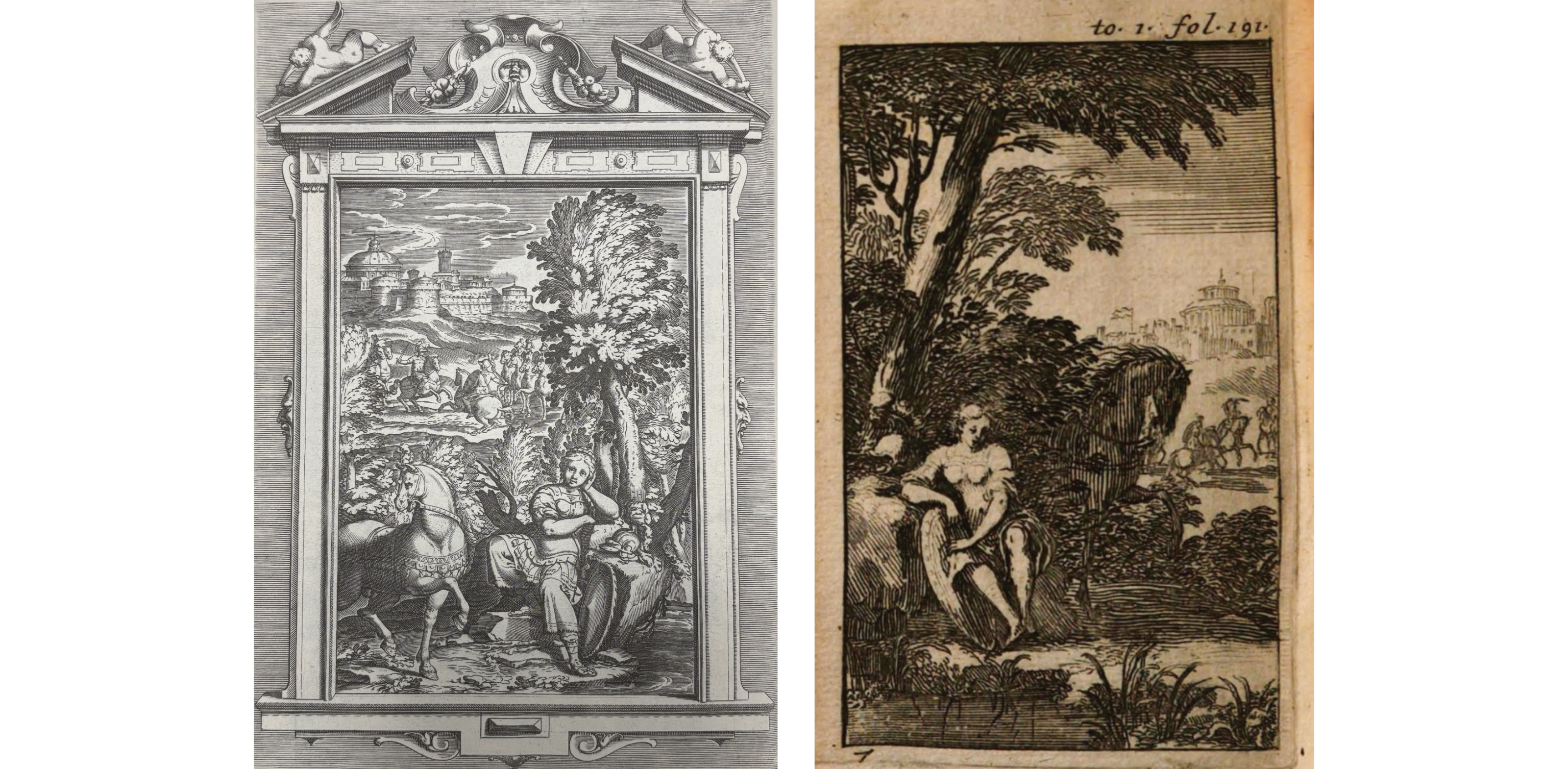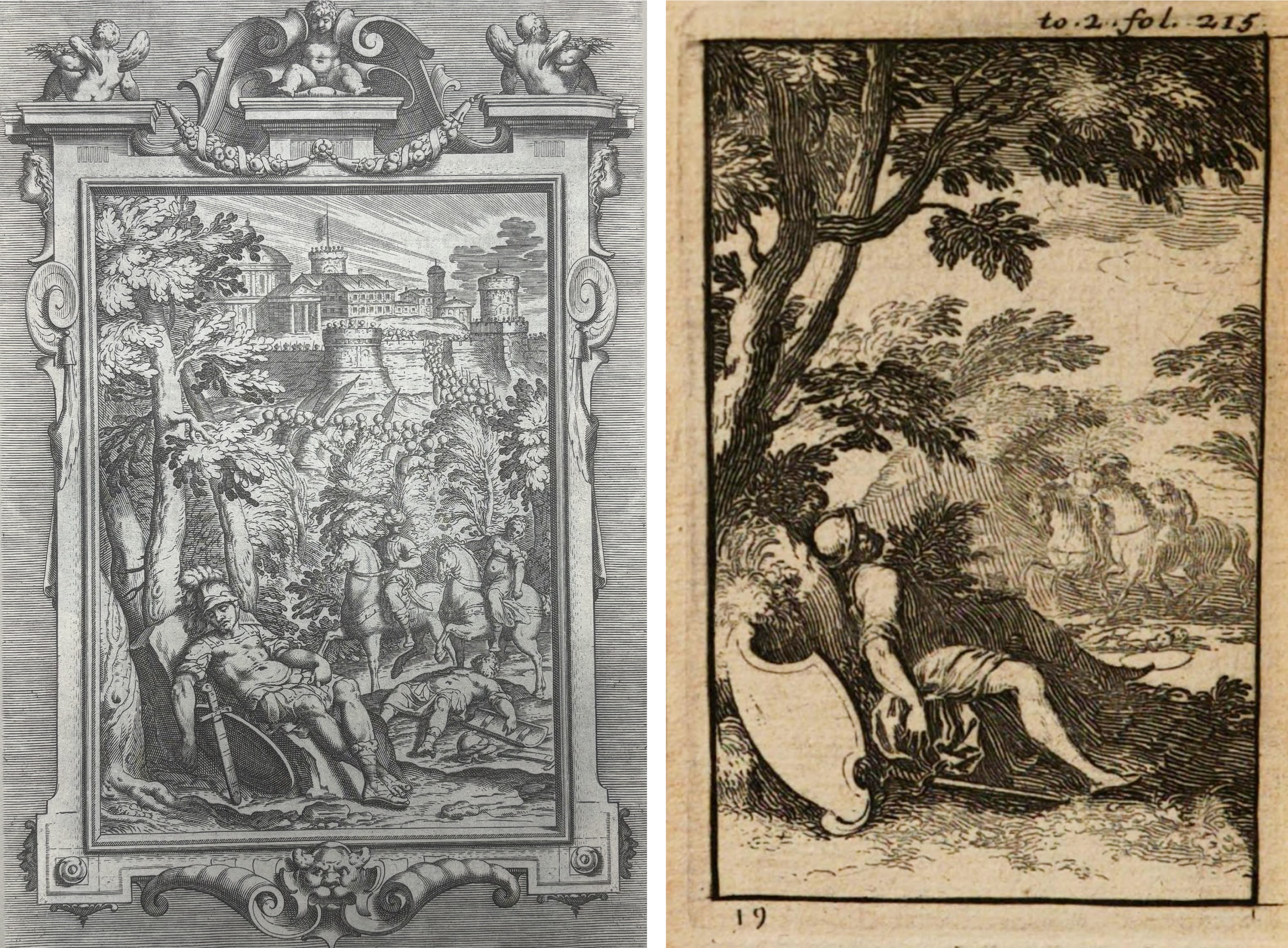 Il rapporto con il modello, chiaro sin dal ritratto di Tasso nel frontespizio che ricalca quello dell’edizione Pavoni del 1617, è confermato dal fatto che, come nella cosiddetta redazione ‘C’ del Castello (Pavoni 1617) – successiva alla redazione ‘A’ del 1584/1590 (Osanna 1584; Bartoli 1590) e alla ‘B’ del 1604 (Pavoni 1604) – prevalgono le illustrazioni monotematiche: essendoci una fonte così ben definita, non ha senso valutare la selezione degli episodi, dato che sono strettamente dipendenti dal modello. Proprio per questo, però, permangono alcune scelte iconografiche poco felici considerate le dimensioni del libro: se nelle ampie illustrazioni per l’in folio, Castello poteva tranquillamente inserire una seconda scena nel piano successivo, perfettamente ‘leggibile’ da parte del fruitore, lo stesso non può dirsi per le corrispondenti figure di Leclerc. Si prenda ad esempio il caso del canto VII, il primo con un’illustrazione ambientata al di fuori del campo militare: nel 1617, alle spalle di Erminia, si delinea in maniera netta uno scontro tra guerrieri con Gerusalemme sullo sfondo, il che potrebbe far riferimento o all’antefatto – ossia il duello tra Tancredi e Argante del c. VI – o al duello tra il Circasso e il cristiano Raimondo che occupa la seconda parte del canto VII. La donna, invece, è raffigurata in primo piano proprio seguendo le ottave iniziali del canto: dopo la concitata fuga in sella al cavallo non più governabile (Lib. VII, 1), finalmente “giunse del bel Giordano a le chiare acque / e scese in riva al fiume, e qui si giacque” (Lib. VII, 3, 7-8) [Fig. 3]. È chiaro il contrasto tra il locus amoenus che accoglie la donna e il locus terribilis della guerra dietro di lei, mostrando quella stessa opposizione che il lettore troverà nel canto. Nel corrispettivo francese le misure sono ben più ristrette sicché, mentre risalta Erminia colta in una posa eminentemente contemplativa, i soldati sono assolutamente indistinti e a far da tramite tra le bellezze bucoliche e la terribilità guerresca si pone il cavallo, elemento di transizione tra i due piani [Fig. 4]. Il respiro epico di cui si nutrono i versi della Gerusalemme liberata, viene per forza di cose dimidiato nelle più piccole illustrazioni di Leclerc, specie se non ne costituisce il focus principale della scena. È vero che, rispetto alle illustrazioni dell’Adone o degli altri testi per Elsevier-Jolly resiste nella Liberata un afflato bellico, ma la cifra stilistica resta elegante e arcadica piuttosto che tragica e patetica finanche nelle scene di guerra, qualora non siano del tutto tagliate.