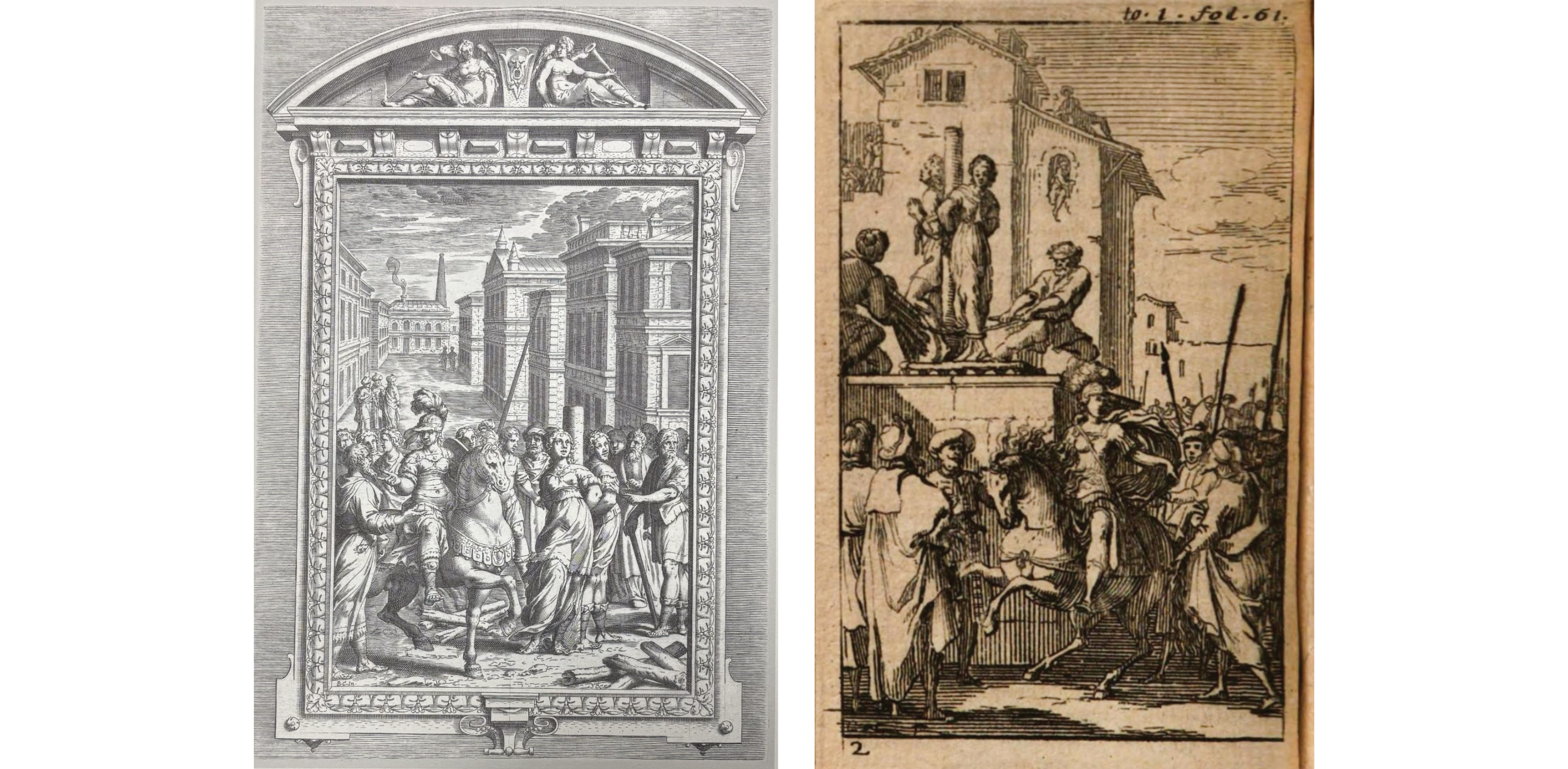 Con il medesimo categorico gesto viene presentata la guerriera da Leclerc che organizza il piano verticalmente. Ciò pone Clorinda in ulteriore risalto, conferendole nuovo impeto rispetto alla versione del Castello, come sottolineato dall’impennarsi del cavallo e dal gonfiarsi del mantello, quasi simulasse un’irruzione sulla scena [Fig. 10]. L’immagine è simile a quella del cavaliere che campeggia al centro dell’Ingresso di Alessandro Magno a Babilonia di Charles Le Brun, peraltro amico e benefattore di Leclerc, oltre che pittore di punta della corte reale. Si tratta però, ed è doveroso precisarlo, di una somiglianza che non sentiamo di spingere fino al punto di riconoscere una filiazione diretta dal quadro del 1663, sia perché schema iconografico piuttosto diffuso sia perché l’inventario post mortem dei beni di Leclerc dimostra che l’incisore non si interessava molto all’arte grafica o pittorica dei suoi contemporanei, almeno non al punto da possederne nei suoi raccoglitori o sulle sue pareti (Préaud 1980, VIII, 14). Tuttavia, andrà ricordato che lo stesso Leclerc appronta una stampa sul medesimo tema dell’Entrée d’Alexandre dans Babylone, che quindi non doveva essergli estraneo (Préaud 1980, VIII, 126-127). Non avendo poi a disposizione la profondità prospettica architettonica del Castello, Leclerc semplifica lo sfondo limitandolo quasi a un solo edificio: tuttavia, le abbozzate figure sui tetti o a cavalcioni della finestra rendono bene il “vulgo de’ pagani” (Lib. II, 37, 1) accorso al rogo di Olindo e Sofronia.