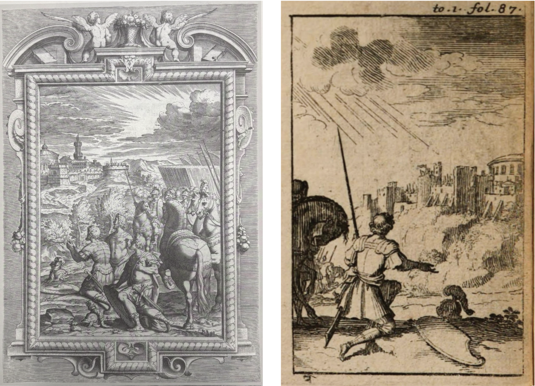 L’eliminazione o la semplificazione della scena in secondo piano proposta dal modello del Castello da parte dell’illustratore francese comporta un’altra conseguenza. Nelle figure di Castello, sin dalla redazione ‘A’ (Osanna 1584; Bartoli 1590), Gerusalemme rivestiva un ruolo centrale e nell’edizione in folio Pavoni 1617: la rappresentazione della città era ben definita. E sebbene il più delle volte sia conservato il particolare di un imponente edificio circolare coperto da una cupola, in cui forse Castello aveva sintetizzato il gran Sepolcro e il Tempio di Salomone (Benassi 2017), la perizia architettonica di Leclerc non emerge quasi mai nell’operazione editoriale di Elsevier-Jolly, non solo nella Liberata ma anche nelle altre opere, tanto per il ristretto formato quanto per il registro meno elevato che il formato ristretto finiva per imporre.