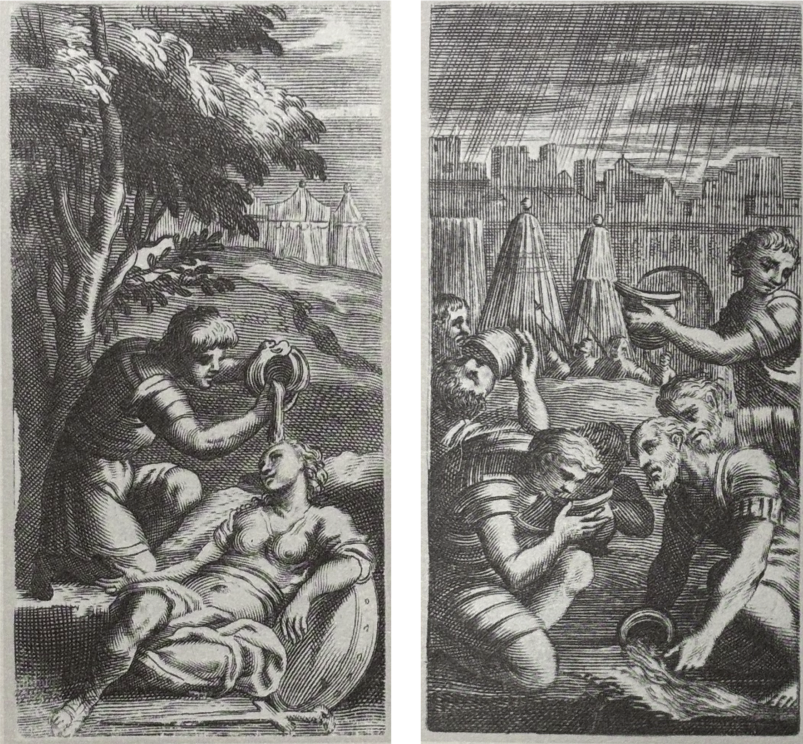 Tra l’altro, in questo modo, si crea nell’edizione Andreoli un significativo dittico di immagini unite dall’elemento salvifico dell’acqua: come l’acqua del battesimo aveva salvato Clorinda nell’illustrazione del canto XII, ora la pioggia inviata da Dio salva il campo cristiano nel canto XIII [Figg. 21-22].