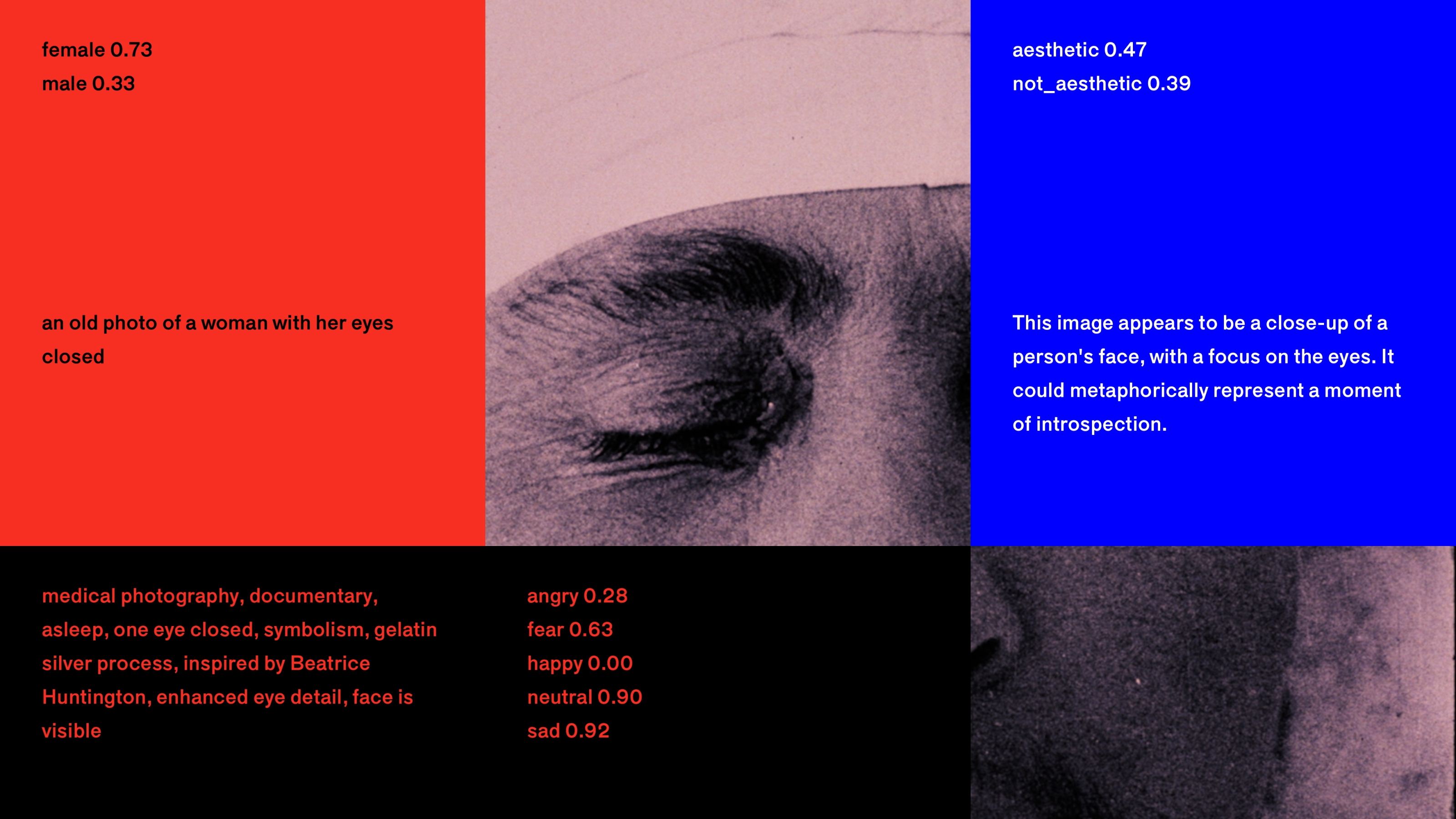 R | Il concetto di visione nei sistemi di computer vision è un tema centrale nella nostra riflessione. La visione delle macchine è mediata da raccolte di dati (archivi, dataset) che riflettono una rappresentazione parziale della realtà, fatta di bias, di lacune, che producono talvolta risultati inattesi e non spiegabili. “Vedere” per un modello è un'operazione di calcolo che avviene nell'intersezione tra immagini e parole. L'immagine, in questo scenario in cui un modello descrive un contenuto visivo, diventa la struttura per generare dati testuali che vengono prodotti da processi computazionali, spesso opachi, non direttamente esperibili dalla comprensione umana.