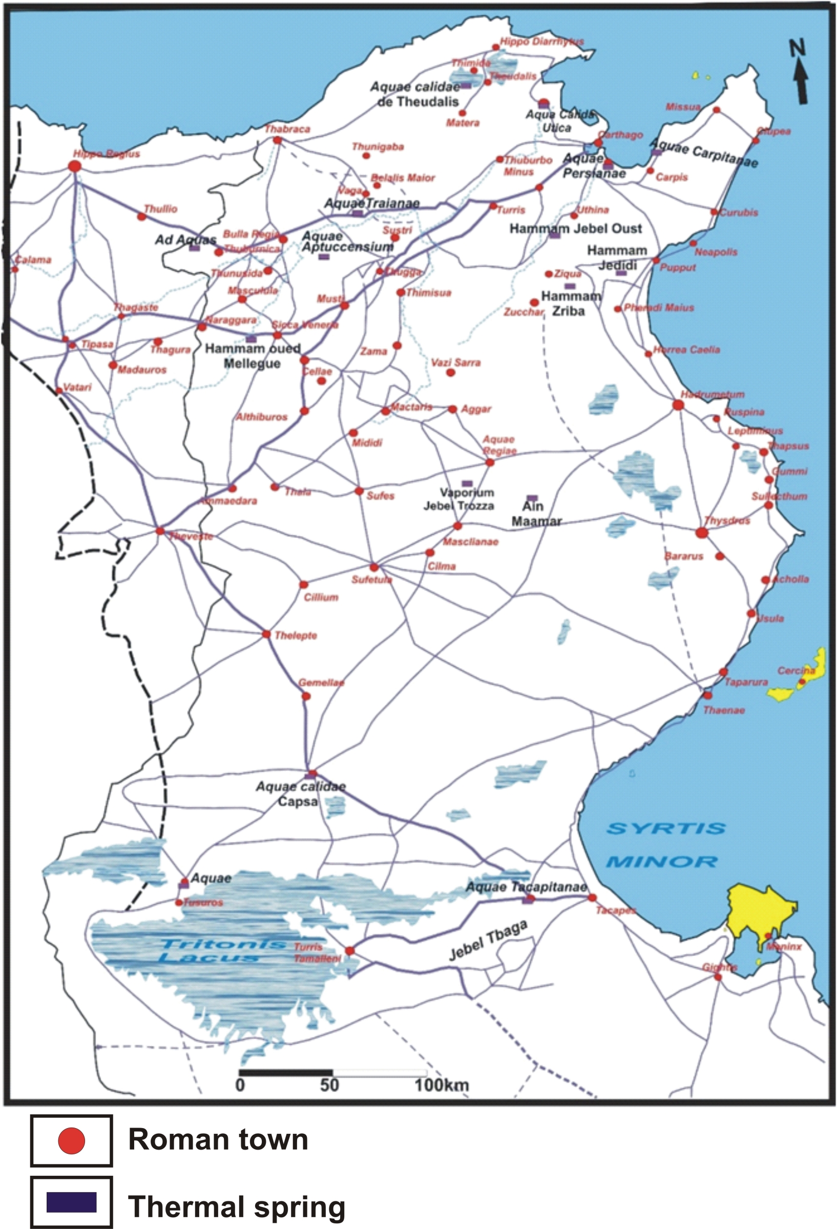 Among the sixteen (16) currently identified aquae calidae and thermal structures, five (5) are located in urbes Romanae: Aqua calida of Utica, Aquae Persianae, Aquae calidae of Capsa, Aquae Tacapitanae, and Aquae.