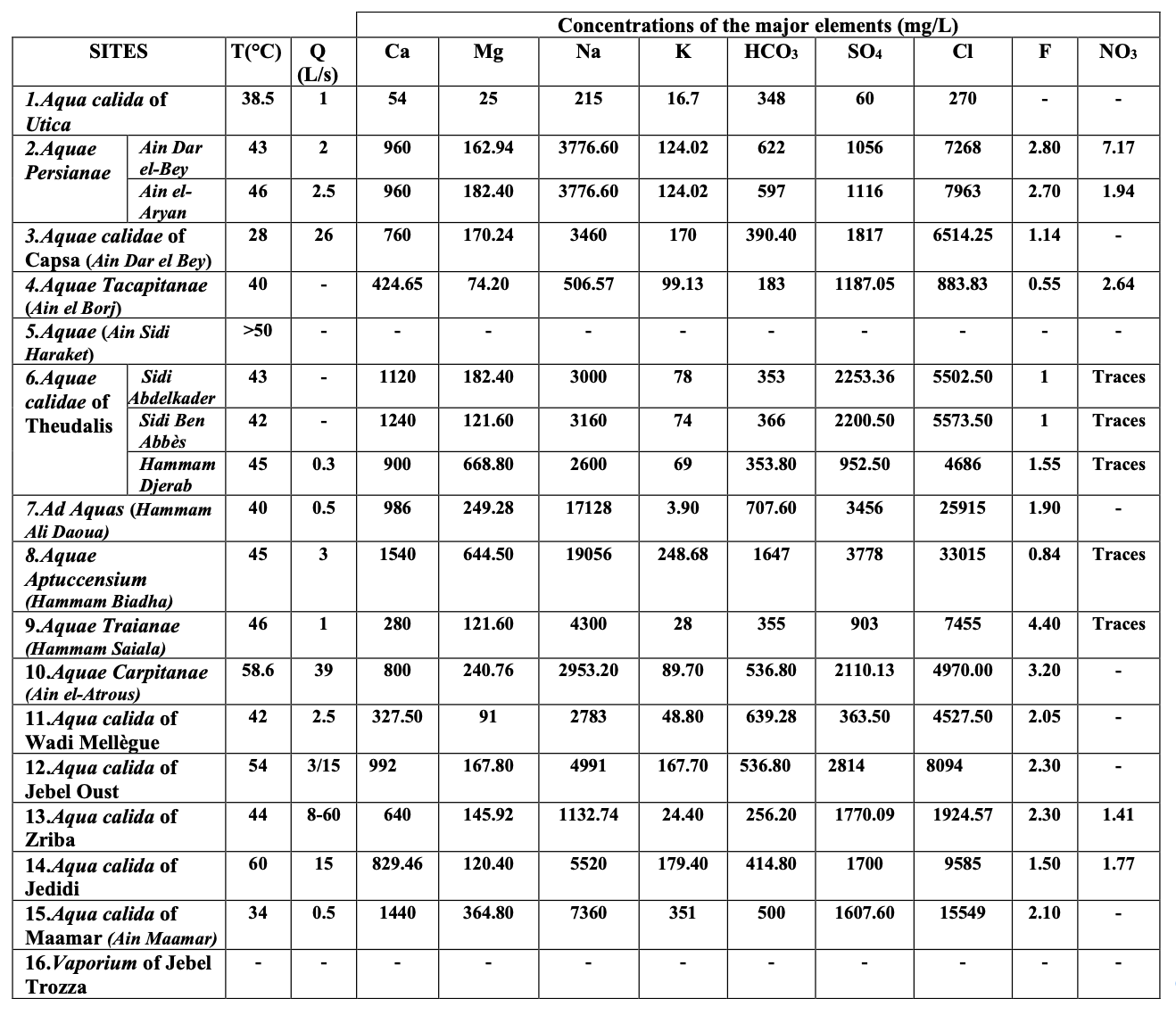 The preserved Roman thermal constructions range from modest-sized baths (e.g., Ad Aquas, Aquae Traianae, Hammam Wadi Mellègue, Aqua calida of Maamar and the Vaporium of Jebel Trozza) to more elaborate thermal complexes (e.g., the Thermal Station of Jebel el Oust). Future archaeological surveys and excavations at these sites will undoubtedly enrich the existing data, and thereby help refine their typology. Physicochemical and mineral analyses indicate that spring waters are generally strongly sodium-chloride or calcium-sulphate in types, sometimes enriched in manganese. Their temperatures typically exceed 40 °C, while their flow rates vary considerably from 0.5 to 29 L/s. [Table].
