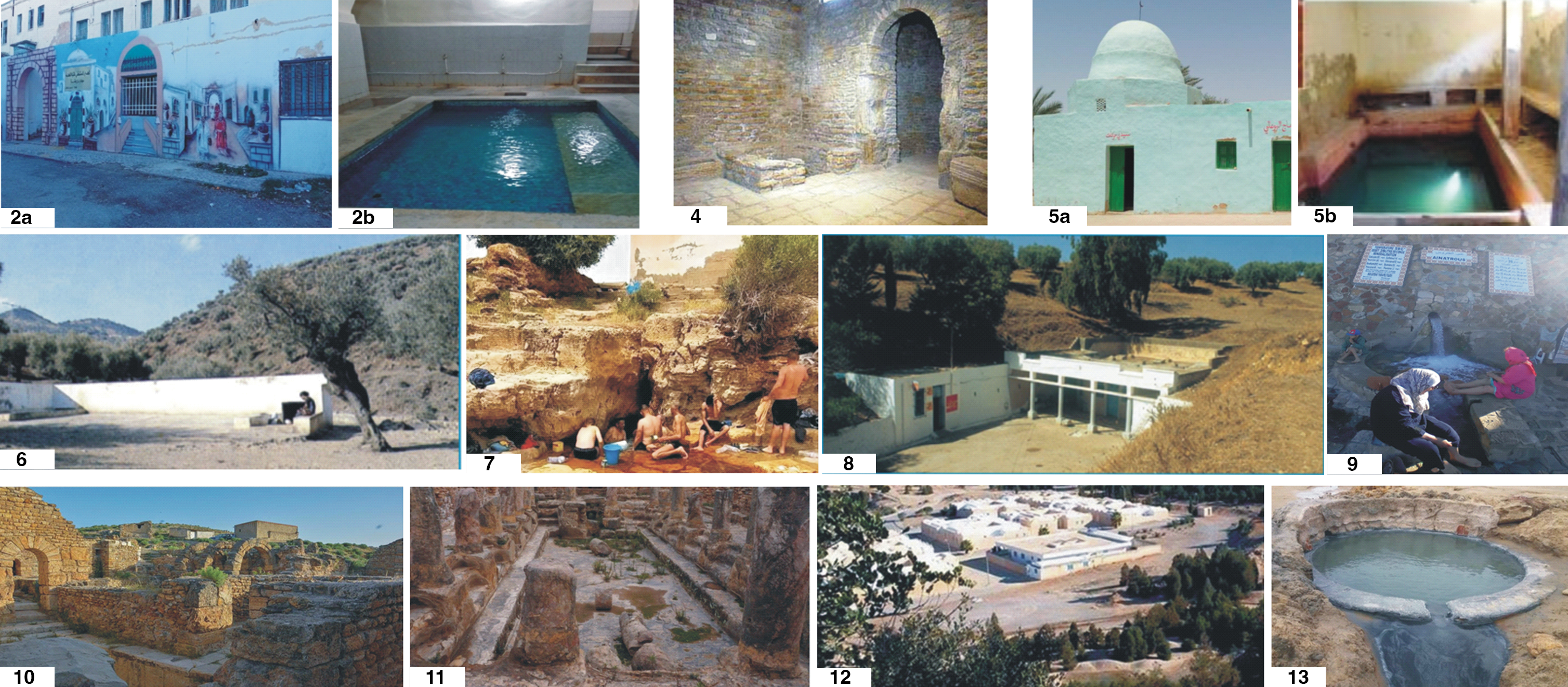 Figures in order | 2a-b: Ain and Hammam Dar el-Bey (photo by the author); 4: Vestiges of the ancient baths incorporated into hammam el Borj / Hammet Gabès; 5a: The baths of the Marabout Sidi Haraket built over Roman thermal structures (Chtioui and Sila 2021, 69); 5b: The baths of the Marabout Sidi Haraket built over Roman thermal structures (photo by the author); 6: Hammam Ali Daoua (Office Du Thermalisme 2000, 49); 7: Hammam Biadha (photo by the author); 8: Hammam Saiala (photo by the author); 9: Ain el-Atrous (Korbous) (photo by the author); 10: Hammam Wadi Mellègue; 11: Thermal complex of Jebel el Oust ; 12: Hammam Jedidi; 13: Ain Maamar basin (photo by the author).
