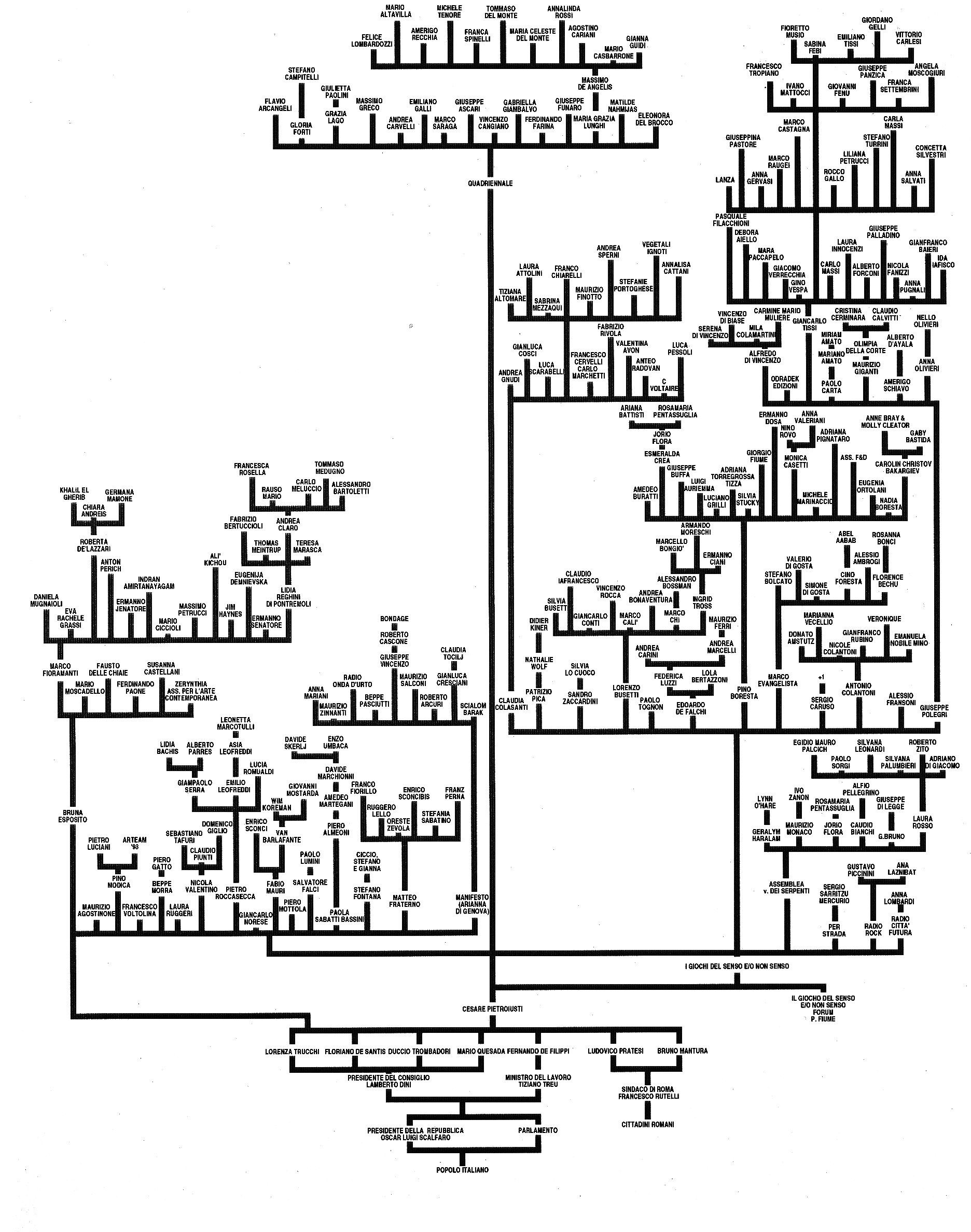 Fra i 170 artisti ufficialmente selezionati, non ce n’era quasi nessuno di quelli con cui avevo, negli anni precedenti, condiviso esperienze e prese di posizione. Di conseguenza, pensai di rimediare in qualche modo, proponendo ad artisti amici o compagni di strada di esporre, con me, nello spazio messo a disposizione per i miei lavori (quantificato, da regolamento, in un certo numero di metri quadrati di parete o di pavimento). Così, quando mi furono chieste informazioni specifiche sul mio lavoro da pubblicare sul catalogo, mandai la seguente didascalia: “Senza titolo, 1996. Oggetti, documenti e materiali vari; misure ambiente”. Inoltre, al posto dell’immagine dell’opera, indicai una lista di nomi – che in effetti è stata pubblicata, inquadrata nella pagina del catalogo come se fosse un’opera: Fausto Delle Chiaie, Disordinazioni, Giovanni Di Stefano, Filippo Falaguasta, Salvatore Falci, Stefano Fontana, Roberto Galeotti, ‘Giochi del Senso e/o Nonsenso’ (Pino Boresta, Lorenzo Busetti, Antonio Colantoni, Sergio Caruso, Marco Evangelista, Alessio Fransoni, Patrizio Pica, Giuseppe Polegri, Sandro Zaccardini), Amedeo Martegani, Ivano Mattocci, Pino Modica, Piero Mottola, Giancarlo Norese, Premiata Ditta, Laura Ruggeri, Anteo Radovan, Marco Samorè, Nicola Valentino e l’Archivio di Sensibili alle Foglie, Sebastiano Tafuri, Marco Vaglieri, Francesco Voltolina. In questa lista compaiono alcuni degli artisti del gruppo ‘Jartrakor’ (con cui avevo lavorato alla fine degli anni ’70 e nei primi anni ’80)[1], gli artisti del ‘Gruppo di Piombino’ (sodalizio attivo fra 1987 e 1992)[2], artisti milanesi e bolognesi conosciuti e frequentati a metà degli anni ’90, e va inoltre notata l’importante presenza di Sensibili alle Foglie, casa editrice e archivio di manufatti artistici provenienti da istituzioni totali come manicomi e carceri e di testimonianze di prima mano di ex-brigatisti o appartenenti ad altri gruppi politici che avevano, negli anni ’70, scelto la lotta armata[3]. Infine, è indicato il (folto) gruppo di artisti denominato ‘Giochi del senso e/o Nonsenso’ di cui, all’epoca, facevo parte già da un paio d’anni[4]. Con questi ultimi parlai estesamente del progetto. Quasi subito, da tali discussioni, venne fuori la proposta di estendere ulteriormente, ovvero, indefinitamente, l’invito a tutti coloro che avessero voluto partecipare, a qualsiasi titolo e per qualsiasi motivo, fossero artisti o meno. L’idea sembrò quella giusta, e tutti cominciammo a darci da fare per diffonderla il più possibile. A parte il passaparola e alcune affissioni murali (illegali), riuscimmo anche a far pubblicare la notizia su qualche giornale. La posta elettronica – e ancora meno le reti sociali digitali – non esisteva o almeno era ancora molto poco diffusa.