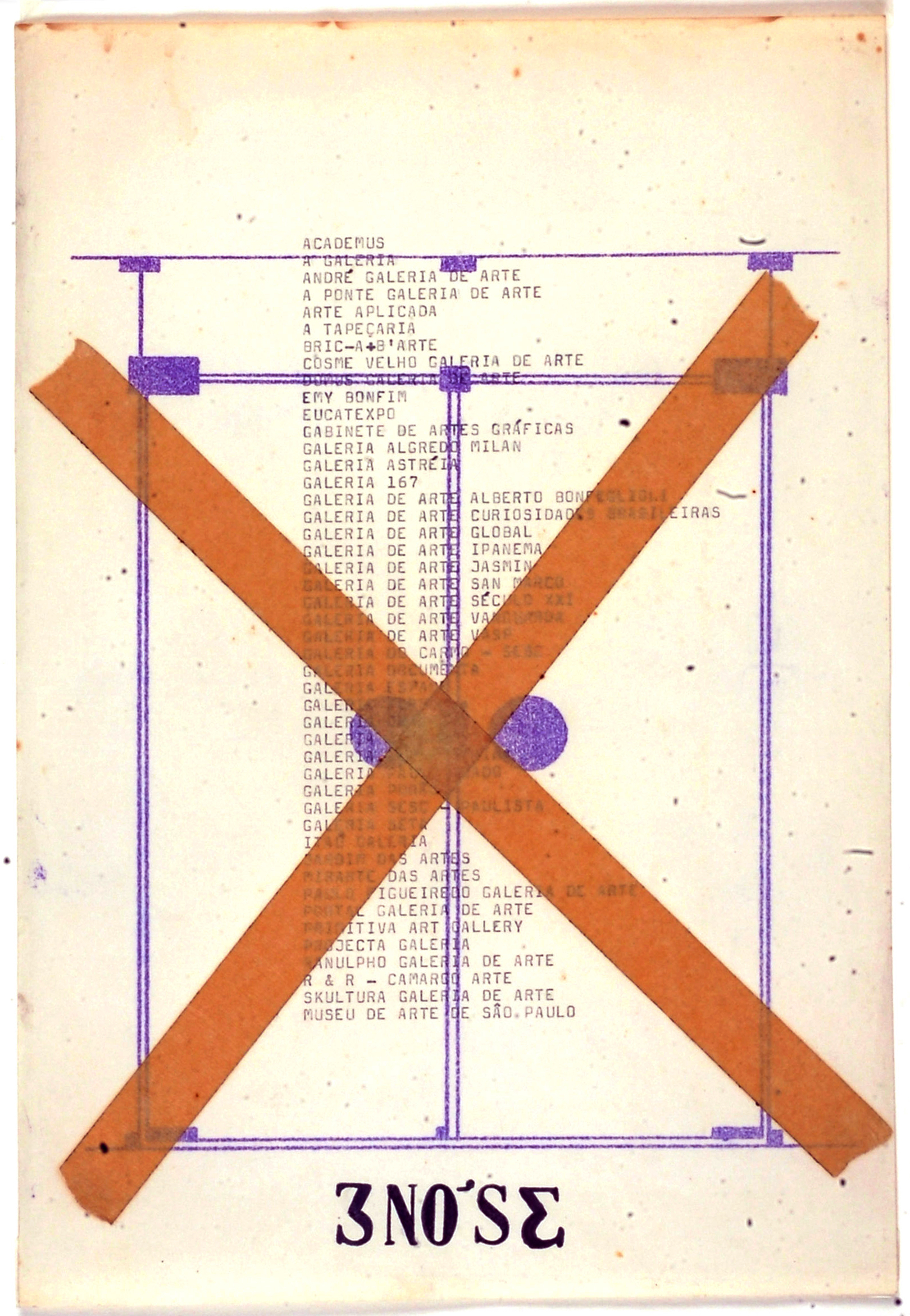 Given the profound symbolic charge the museum held for the collective, it is hardly surprising that it was also central to one of their earliest interventions, X-Galeria. On the night of 2 June 1979, the entrances of twenty-seven commercial art galleries – institutions that radicalize, even pornographize, the separation produced by the interplay of spectacle and consumption – along with that of a museum, specifically that MASP on Avenida Paulista – were sealed with a large ‘X’ of masking tape. The gesture was accompanied by mimeographed leaflets stating: “O que está dentro fica / O que está fora se expande” [What is inside stays / What is outside expands]. That the museum functioned as both the starting point and the endpoint of 3NÓS3’s brief trajectory reveals a paradigmatic hostility toward the aridity of institutional containers. Yet these two episodes gain their fullest generative power when mapped cartographically – when seen in proximity and tangency to the other urban actions that unfolded between them. Between 1979 and 1982, the collective produced at least seventeen further interventions, employing the city in its full semantic breadth as their medium – its monuments, arterial roads, viaducts, buildings, plazas, and the myriad forms of its expansion. With a single exception – the work ARTE, executed in Porto Alegre, the hometown of França and seat of the kindred artistic group Nervo Óptico[4] – their canvas was São Paulo. The metropolis thus became a surface upon which to inscribe lines that traversed heterogeneous spaces, manifesting a continuity only in fragments: a relational and desecrating diagram that existed solely in its state of dissemination.