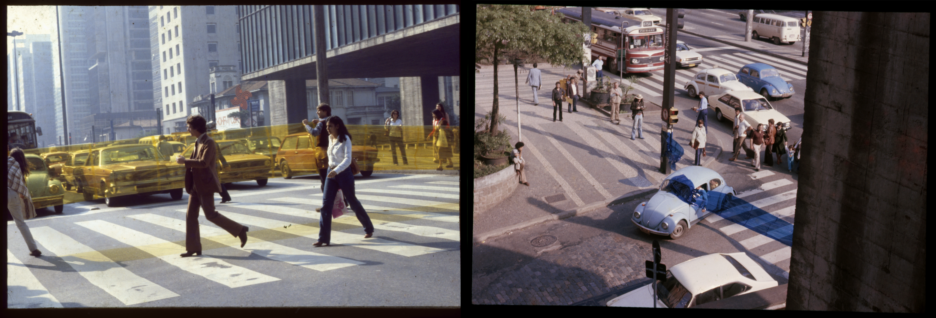 3-4 | 3NÓS3, Interdição, urban intervention with colored cellophane bands, Avenida Paulista, São Paulo 1979.