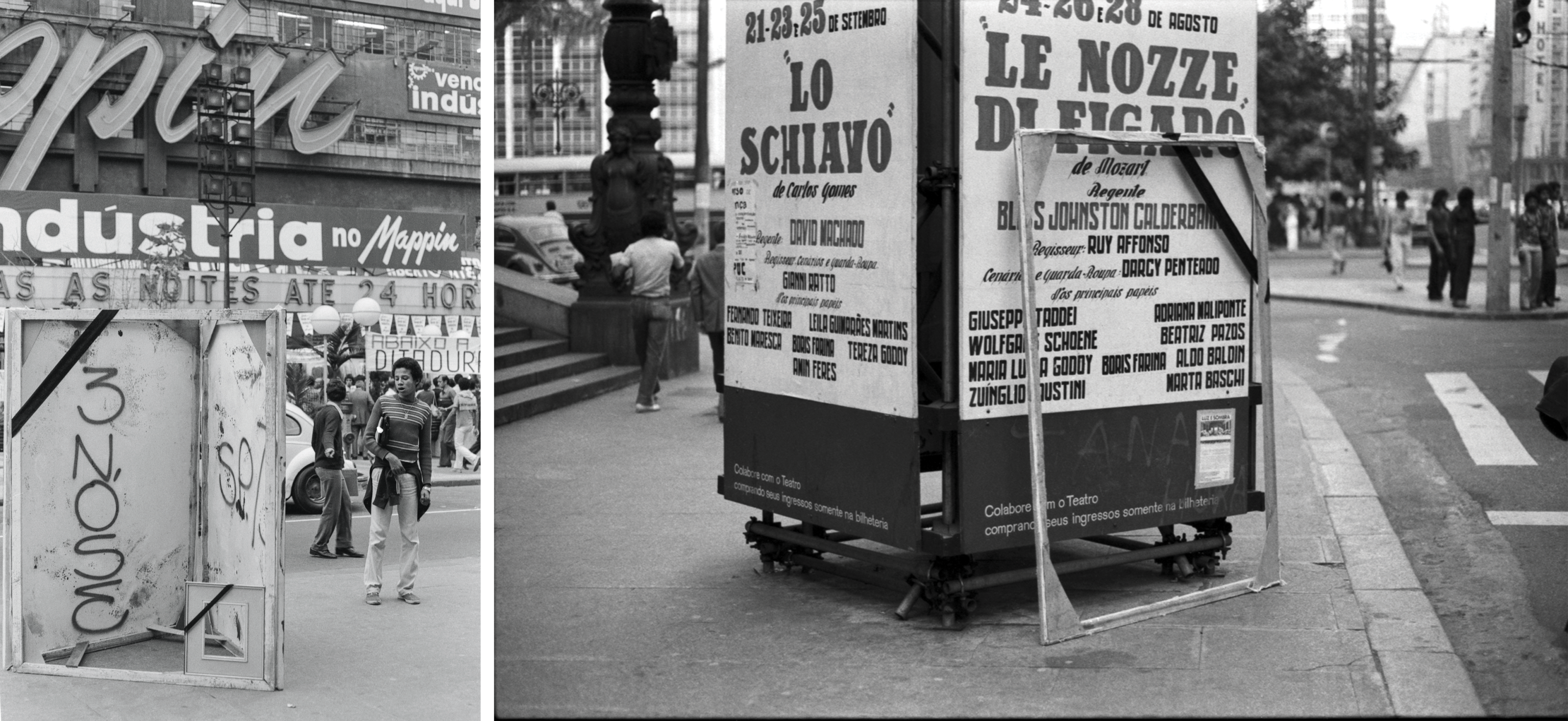 In contrast, Ensacamento and Tríptico – together with X-Galeria – addressed what Fabris identifies as a distinct sphere of action. Here, the primary subject shifts from the city to the art circuit itself. Yet the fundamental context, spirit, and methodology of interference remained unchanged, for, as Fabris notes, “what 3NÓS3 calls into question, ever since the first actions of 1979, is the relationship of art with the city” (Fabris [1984] 2017, 206). For Tríptico [Figs. 6, 7], three rectangular panels – 2.20 x 1.40m each – were arranged to form a triangular sculptural ensemble on the sidewalk in front of the Theatro Municipal de São Paulo on Rua Xavier de Toledo – the iconic site of the 1922 Modern Art Week that launched Brazilian modernism (Tarsila do Amaral, Anita Malfatti, Mário de Andrade, among others). Each artist claimed one panel: Ramiro and França worked pictorially, while Hudinilson Jr. employed assemblage. It became the collective’s longest intervention, lasting three days, from 24 to 26 August 1979. The group meticulously documented the public’s reaction and the piece’s gradual transformation until, as Ramiro notes, “the screens were finally removed by the Sanitation Department” (1998, 247). Significantly, the photographic record shows that the piece was largely ignored as an artistic intervention. Instead, it was read as advertising for theatre events, used as a bulletin board for flyers, and ultimately treated as “an ephemeral piece of garbage” (Aldana 2008, 218), ripped apart and nearly destroyed. In its ambiguous public reception – oscillating between overlooked artwork, appropriated advertising space, and urban detritus – Tríptico engaged an already emerging condition in late-1970s São Paulo: the saturation of the urban visual field and the unstable boundary between artistic gesture and communicative noise.