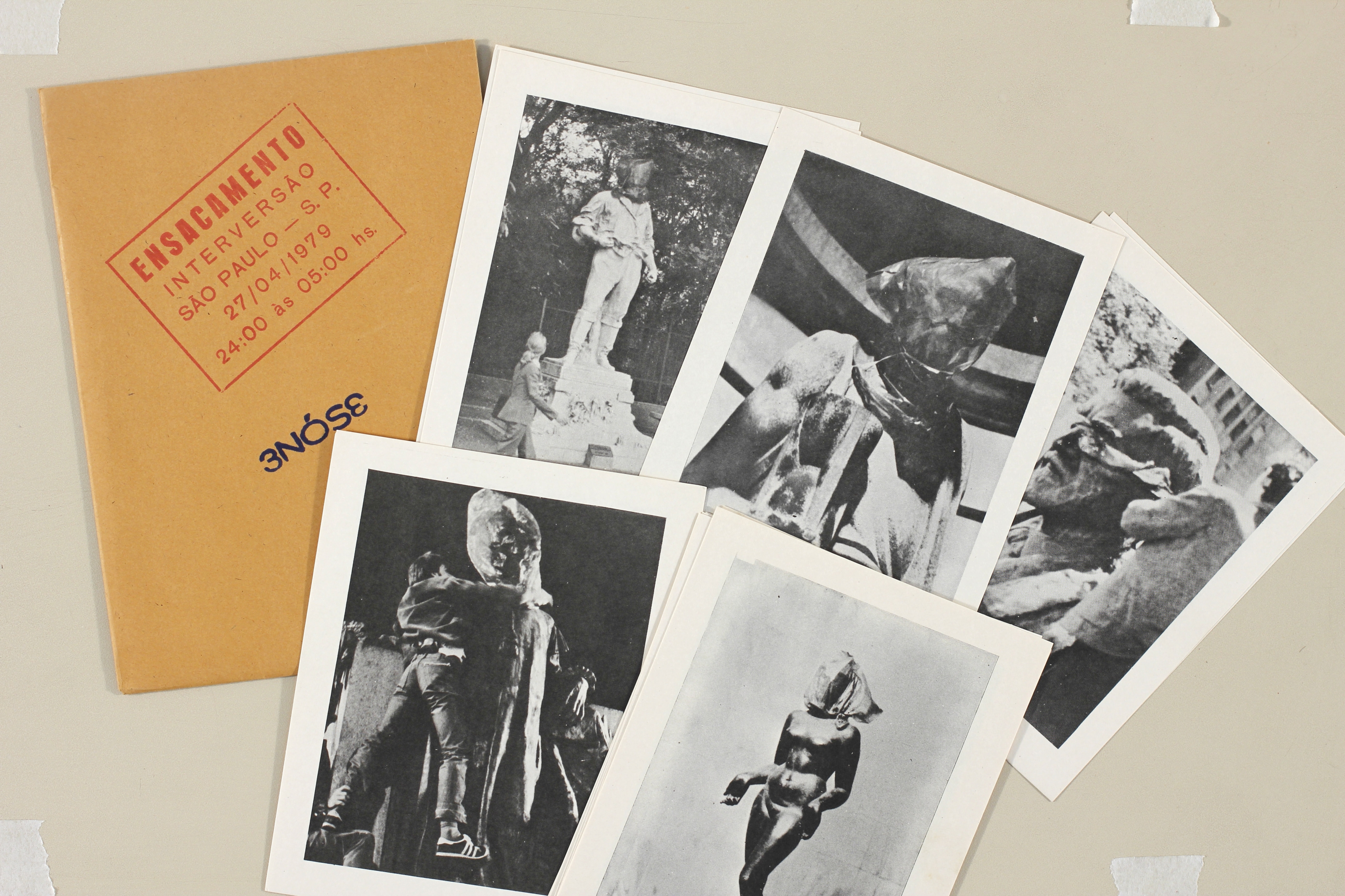 If Tríptico explored the blurred line between art and urban debris, the collective's inaugural action, Ensacamento took a more directly confrontational approach to public symbolism. The latter remains the group’s most famous action, their very first, and, retrospectively, the one that most clearly condenses the operative logic of their early practice. It unfolded between midnight and five in the morning on 27 April 1979. Hudinilson Jr., Ramiro, and França moved furtively through the city, hooding the heads of public monuments and historical sculptures with black or blue trash bags tied closed with a rope – like a noose, simulating strangulation. They began, not by chance, at the Monument to the Independence of Brazil, erected on the banks of the Ipiranga Brook where Dom Pedro I declared the country’s independence from Portugal in 1822. From there, they proceeded through a constellation of civic and historical markers: Praça Marechal Deodoro; the Monumento às Bandeiras at the entrance to Ibirapuera Park, celebrating the bandeirantes (colonial-era Portuguese explorers and slave raiders) and their territorial conquests; the busts of John Kennedy in Largo do Arouche and Giuseppe Verdi in the Vale do Anhangabaú; the Monument to Carlos Gomes in Praça Ramos de Azevedo, inaugurated in 1922 for the centennial of independence; and finally the Monument to Anhanguera, another bandeirante, situated opposite Trianon Park on Avenida Paulista, among many others. In total, some sixty public sculptures were bagged, their heads shadowed, their moral gaze upon the city effectively blinded.