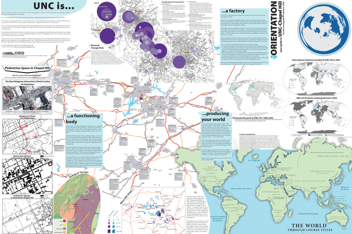 La loro prima opera, chiamata DisOrientation Guide, risale al 2006 ed è basata sull’analisi cartografica della stessa università nella quale lavorano i membri del collettivo, la North Carolina University at Chapel Hill, e ha come obiettivo quello di visualizzare esplicitamente le relazioni regionali e globali di produzione di conoscenza e di lavoro (labour) dell’istituzione [Fig. 2]. Versioni successive di questo progetto hanno incluso progressivamente mappe e grafici che analizzano e decriptano il funzionamento delle classifiche universitarie, il contributo dei migranti alla produzione del sapere, elementi sulla precarizzazione del lavoro accademico e la localizzazione delle lotte per un’istruzione superiore alternativa su scala globale. Il lavoro del 3.C comprende mappe stampate, processi di progettazione collettiva ed esplorazioni di cartografia autonoma che uniscono tecniche analogiche e digitali. Progressivamente, in seguito alle prime versioni cartacee della DisOrientation Guide, i membri del 3.C hanno introdotto l’utilizzazione di software GIS, per raccogliere, elaborare e visualizzare i dati spaziali. Questi sistemi informatici sono progettati per acquisire, memorizzare, analizzare e rappresentare dati georeferenziati, cioè legati a specifiche posizioni nello spazio. Essi vengono utilizzati principalmente per mappare e analizzare dati geografici in modo preciso e standardizzato, sia per scopi ufficiali di controllo e gestione del territorio, sia per finalità militari. L’attività del 3.C utilizza invece i sistemi GIS come strumento non solo tecnico, ma politico e collettivo per far emergere relazioni di potere e sistemi di sfruttamento legati a territori e contesti specifici. Nella loro rappresentazione finale, tutti i progetti dei 3.C condividono la coesistenza, su uno stesso supporto, foglio o schermata, di mappe a scale differenti, che consentono di cogliere a colpo d’occhio il modo in cui uno spazio puntuale e circoscritto, come ad esempio quello di un campus universitario, sia strettamente connesso a un sistema molto più ampio, operante su scala regionale e persino globale. Tale coesistenza rende visibili rapporti di potere e di interdipendenza, ma permette anche di mettere in evidenza come l’appartenenza a un campus universitario produca una specifica modalità di comprensione e di interazione con il mondo esterno che il progetto tende anche a sottolineare esplicitamente.