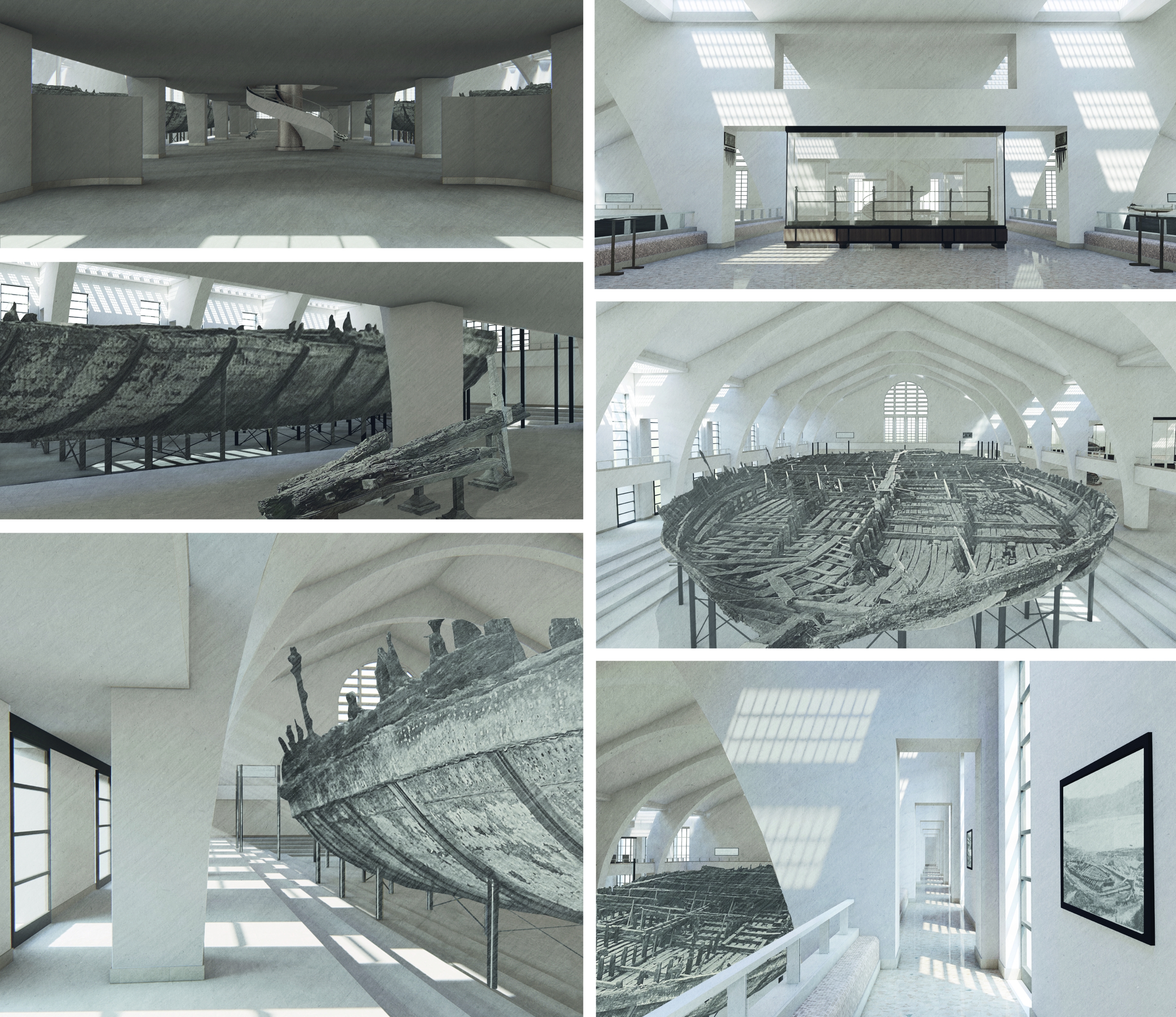 Dopo l’alaggio, sistematicamente accompagnato da un’azione propagandistica e mediatica dalla portata anche internazionale (vedi Grippa, Redemagni in questo stesso numero), gli scafi furono protetti in modo provvisorio e nel 1933 una nuova commissione, sempre presieduta da Ricci, fu incaricata di valutare alternative progettuali e tecniche per la realizzazione di un museo stabile. In pochi mesi furono presentate almeno dieci ipotesi, elaborate dallo stesso Ucelli, da Morpurgo, dall’architetto Italo Gismondi e da un esperto di costruzioni metalliche, Stefano Rolfi Mondovì (Porretta, Incutti 2025). In ragione dell’urgenza conservativa, dei tempi contingentati e della necessità di contenere i costi, la maggior parte delle proposte considerarono l’utilizzo di hangar dismessi per dirigibili, già utilizzati per il ricovero provvisorio di uno dei due relitti in virtù delle loro caratteristiche dimensionali che rispondevano perfettamente a quelle delle navi. Proprio quando la decisione definitiva sembrava orientarsi su uno dei progetti di Gismondi, fu invece inaspettatamente scelto quello che Morpurgo aveva presentato ben due anni prima, nel 1931, anch’esso ispirato alla spazialità degli hangar, ma completamente realizzato in cemento armato (vedi anche il contributo di Tullia Iori in questo numero).