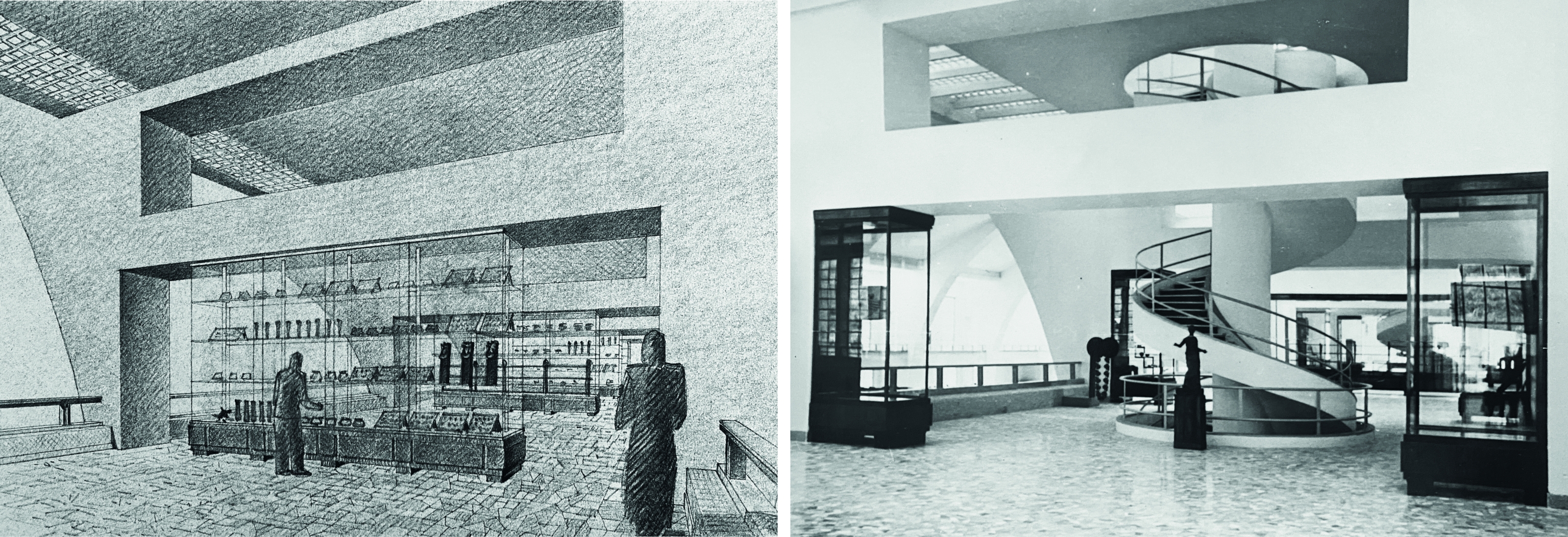 4 | L’allestimento del ballatoio al secondo piano: a sinistra, disegno prospettico a matita di Vittorio Morpurgo; a destra, le vetrine realizzate secondo il progetto di Giuseppe Moretti (SABAP-MET-RM, Guido Ucelli).