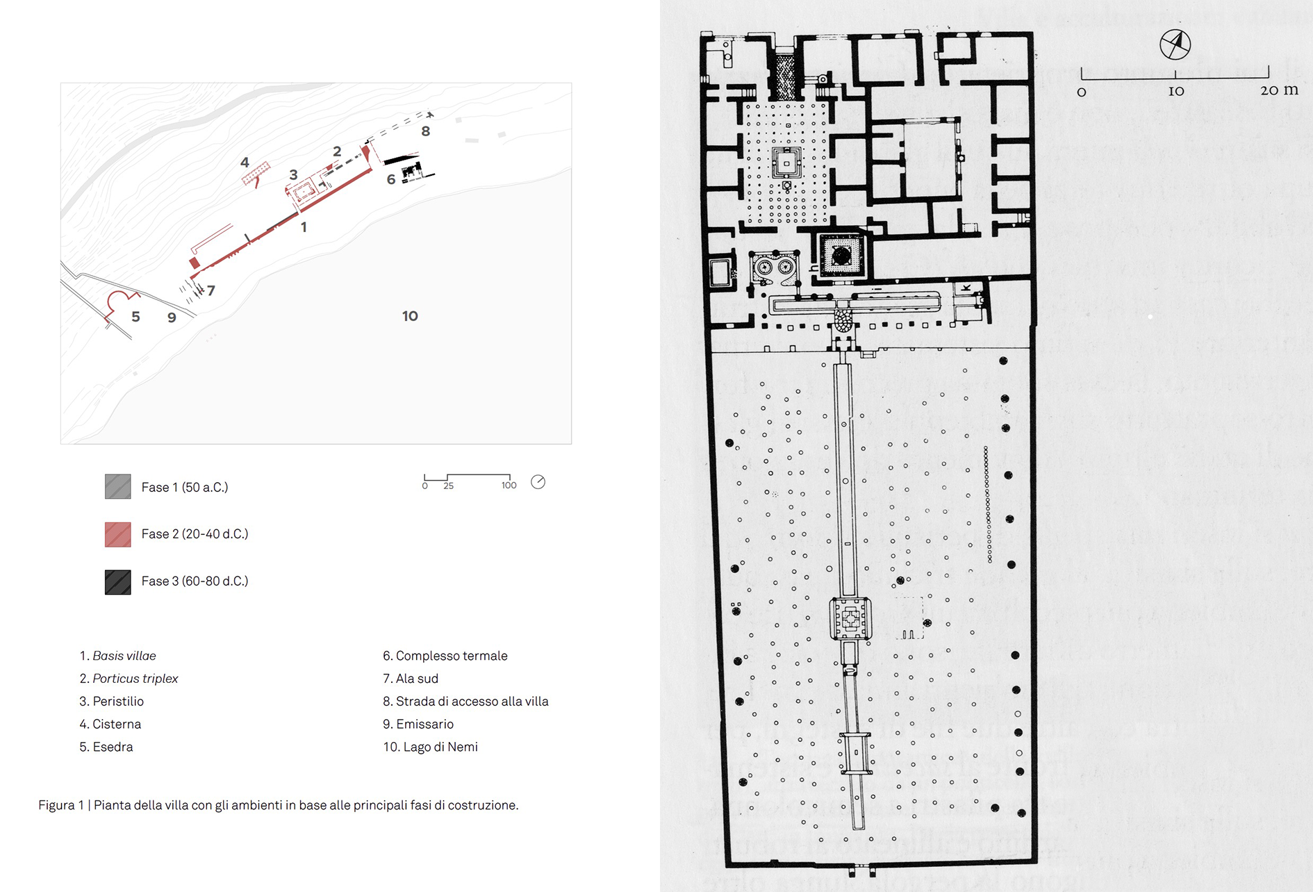 Nel settore ovest del lago, oltre all’emissario ben studiato e in parte percorribile grazie ai lavori di sistemazione operati dalla Soprintendenza (Castellani et al. 2003; Placidi 2010), sorgeva la villa appartenuta in una prima fase a Cesare e in una seconda fase a Caligola, che venne utilizzata dai membri della corte imperiale tra il 60 e l’80 d.C. e in età adrianea [Fig. 1, n. 6]; caduta in disuso, fu frequentata in epoca altomedievale (VI-VII secolo d.C.) per impiantarvi una necropoli e successivamente fu utilizzata come cava di materiali da costruzione (Moltesen, Pulsen 2010 e 2020).