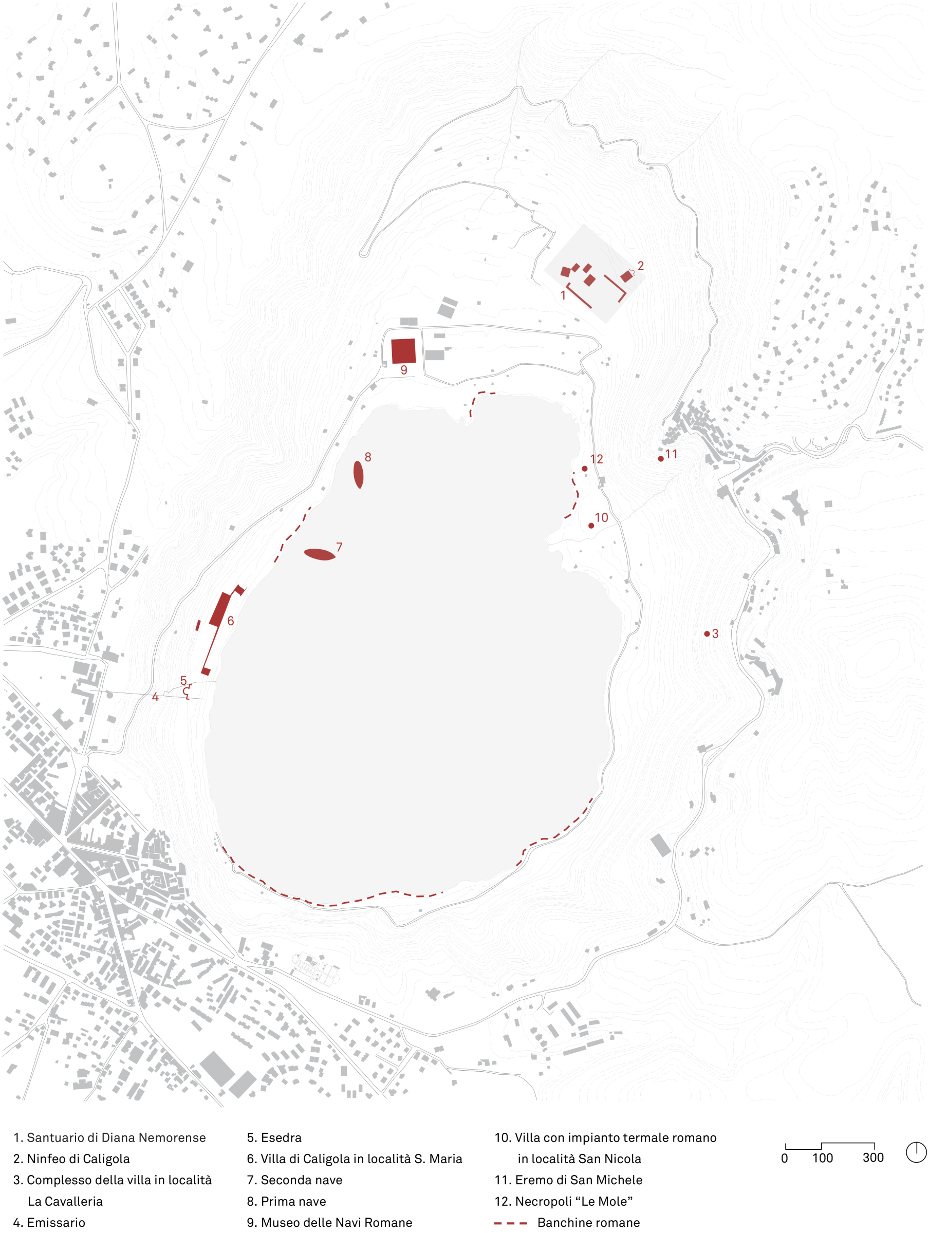 Il lago di Nemi, non disgiunto dal suo contesto naturale e costruito, ha costituito un punto di riferimento di primaria importanza sia nella fase antica sia durante l’epoca moderna e contemporanea: da un lato, per la sua capacità di evocare miti ancestrali legati alla regalità e alla trasmissione del potere (a partire dal mito del Rex Nemorensis, vedi Centanni 2024 con ampia bibliografia di riferimento), dall’altro per l’insieme delle evidenze archeologiche presenti sulle rive e sui fondali del lago stesso (vedi i report nelle Notizie degli Scavi sulle prime operazioni nello specchio lacustre, tra cui Malfatti 1895, Bernabei 1895, e soprattutto l’accurato volume di Ucelli 1950 sul recupero delle due navi imperiali).