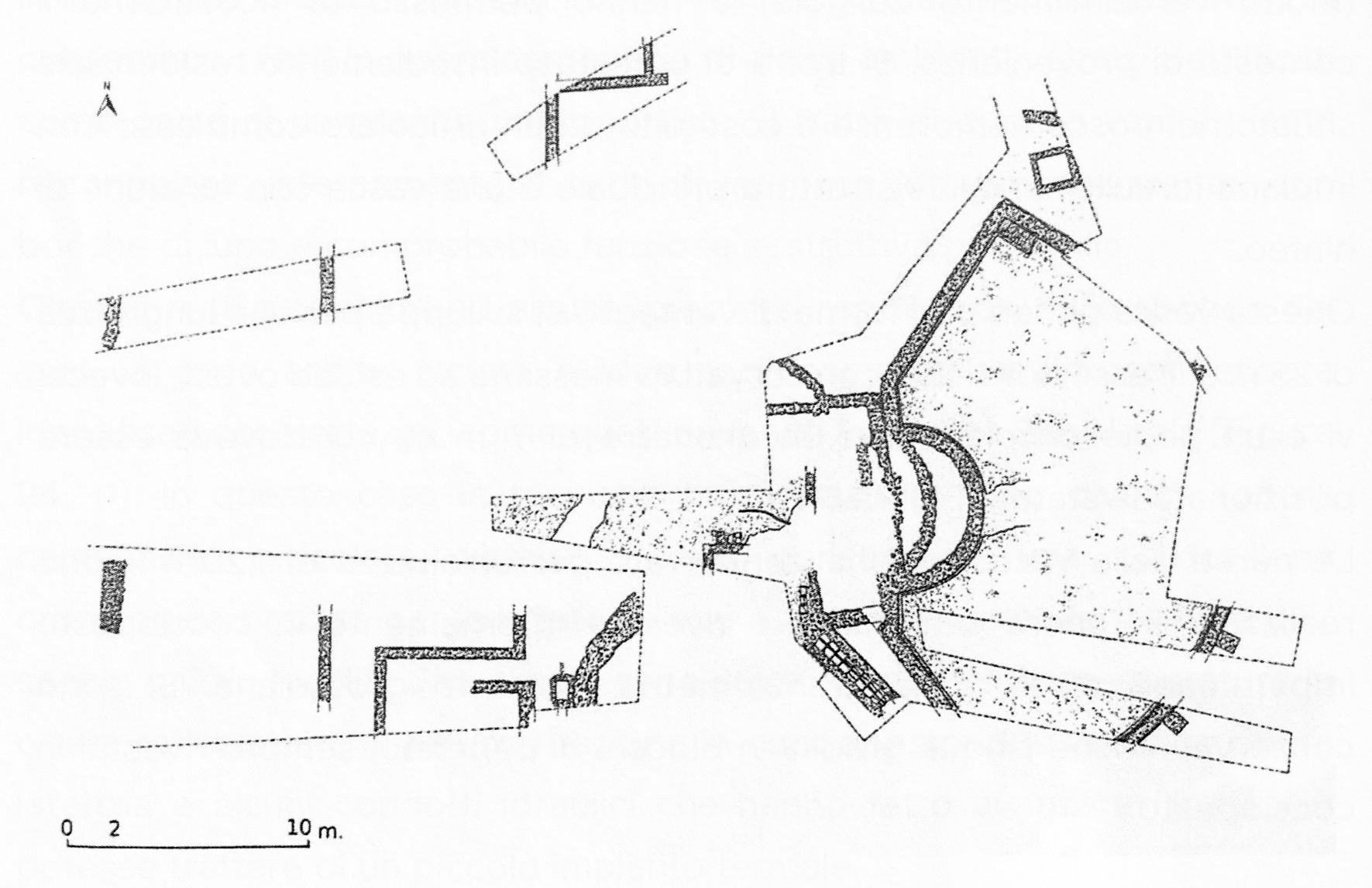 A testimonianza della centralità delle fonti e dell’acqua nel contesto nemorense, occorre ricordare che nel lato orientale del lago sorgevano altri complessi edilizi dotati di impianti idrici (Ghini 2013a). In particolare, in loc. San Nicola è emersa parte di complesso di probabile natura residenziale che era provvisto di un impianto termale: la villa si data dal I secolo a.C. fino al IV secolo d.C. [Fig. 1, n. 10], mentre poco più a sud, in loc. La Cavalleria è stata scoperta una seconda residenza che dovette appartenere a proprietari di alto rango a partire dall’epoca tardorepubblicana, di cui al momento non è stata pubblicata la planimetria [Fig. 1, n. 3 e Fig. 8]. Non si esclude che entrambe le residenze siano state poi inglobate nei possedimenti imperiali, con rifacimenti fra il I-II secolo d.C., ed è probabilmente alla prima età imperiale che va datato un grande ninfeo scoperto nella villa in loc. La Cavalleria [Fig. 9].