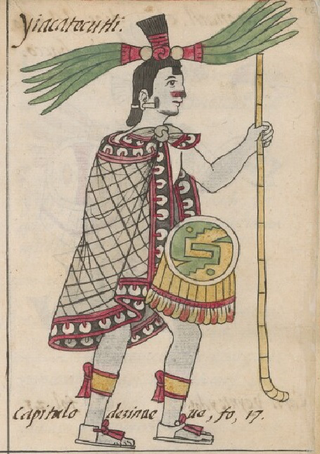 [4] Bernardino de Sahagún, Códice florentino: historia general de las cosas de la Nueva España (in Dibble, Anderson 1961, lib. 1, 44): “quetzalxicalcoliuhquj yn jchimal, ytlacçaia ymac onoc, otlatopile [Su escudo era de plumas de quetzal, en un diseño calado. Su bastón de viaje estaba en su mano]”.