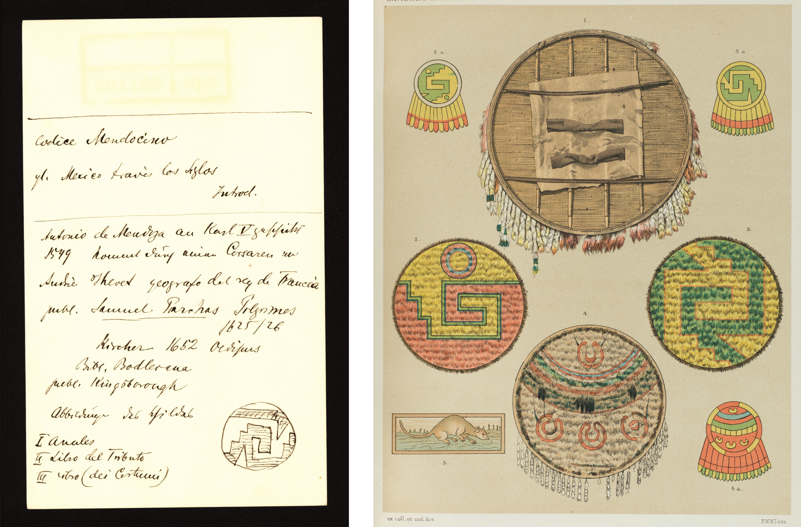 Por otra parte y, a su vez, el aparato burocrático del Emperador no tardó en reconocer el peligro de la presencia del conquistador Hernán Cortés y la peligrosa extensión de su poderío a ultramar. Sólo a poco más de una década de la caída de Tenochtitlán, llegaba al puerto de Veracruz el virrey Antonio de Mendoza (r. 1535-1550), quien recorrió la misma ruta de Cortés hacia el centro de México-Tenochtitlán para sustituir al conquistador en su cargo de poder; ruta que se instauraría como un itinerario simbólico para todos los futuros virreyes que arribarían en representación de la Corona para tomar posesión de la tierra. Es en este contexto en el que debe entenderse el regalo que el virrey Antonio de Mendoza, quien reemplazó a Cortés en sus pretensiones de poder, hubo de hacer a su vez al emperador Habsburgo en los años 1541-42. Mendoza encargó a Francisco Gualpuyogualcal un manuscrito profusamente ilustrado con pictogramas y explicaciones escritas en lengua náhuatl, el mismo que fue intercalado con traducciones al castellano por Juan González en la Catedral de México, conocido hoy como el Códice Mendocino (albergado hoy día en Oxford, Bodleian Library MS. Arch. Selden. A. 1; versión facsimil digitaliza con información histórica). El códice, dividido en tres partes, informaba sobre la vida, la genealogía e historia de los mexicas (primera parte), los tributos de los pueblos indígenas subyugados por el imperio mexica antes de la llegada de los conquistadores – entre ellos el escudo de plumas que dibujó Warburg en su ficha – (segunda parte), y la mitología y las costumbres religiosas de los antiguos mexicanos (tercera parte). Pero, el códice mendocino nunca llegaría a manos del emperador. Como Warburg bien anotó, tomó otros derroteros al caer en manos de los corsarios franceses que interceptaron el navío frente al puerto de Veracruz en 1549, para llegar a manos del cosmógrafo del rey de Francia, André Thevet, en 1553, donde permaneció hasta 1587 cuando el entonces embajador británico de la corte francesa, Richard Hakluyt, lo adquirió por 20 coronas. Una vez en tierras británicas llegó al conocimiento del clérigo anglicano, Samuel Purchas, quien tradujo parcialmente al inglés fragmentos del códice acompañándolos de xilografías en su obra póstuma publicada como Hakluytus Posthumus, or Purchas his pilgrimes (Haklvytvs posthumus, or, Pvrchas his Pilgrimes : contayning a history of the world, in sea voyages, & lande-trauells, London 1625, vol. III, 1066-1117), después de lo cual el mendocino arribó finalmente a la Biblioteca Bodlein de Oxford en 1659 por donación del humanista y jurista John Selden, donde posteriormente Lord Kingsborough se dio a la tarea de reproducirlo en versión facsimilar junto con litografías a color en el primer volumen de su vasta obra, Antiquities of Mexico, en 1831.