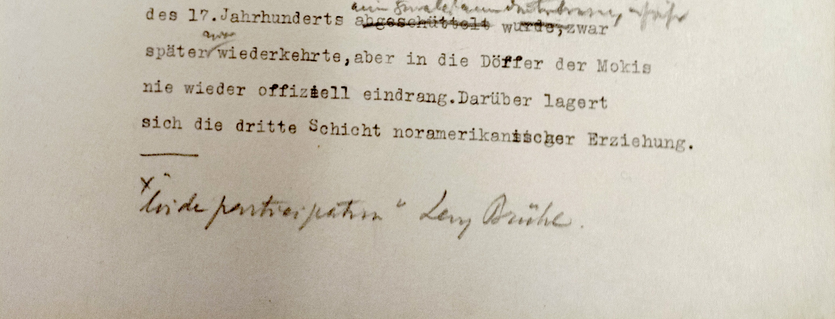 Footnote in the typescript of Bilder aus dem Gebiet der Pueblo-Indianer in Nord-Amerika, with reference to Lévy-Bruhl’s loi de participation [WIA III 93.1, fol. 2].