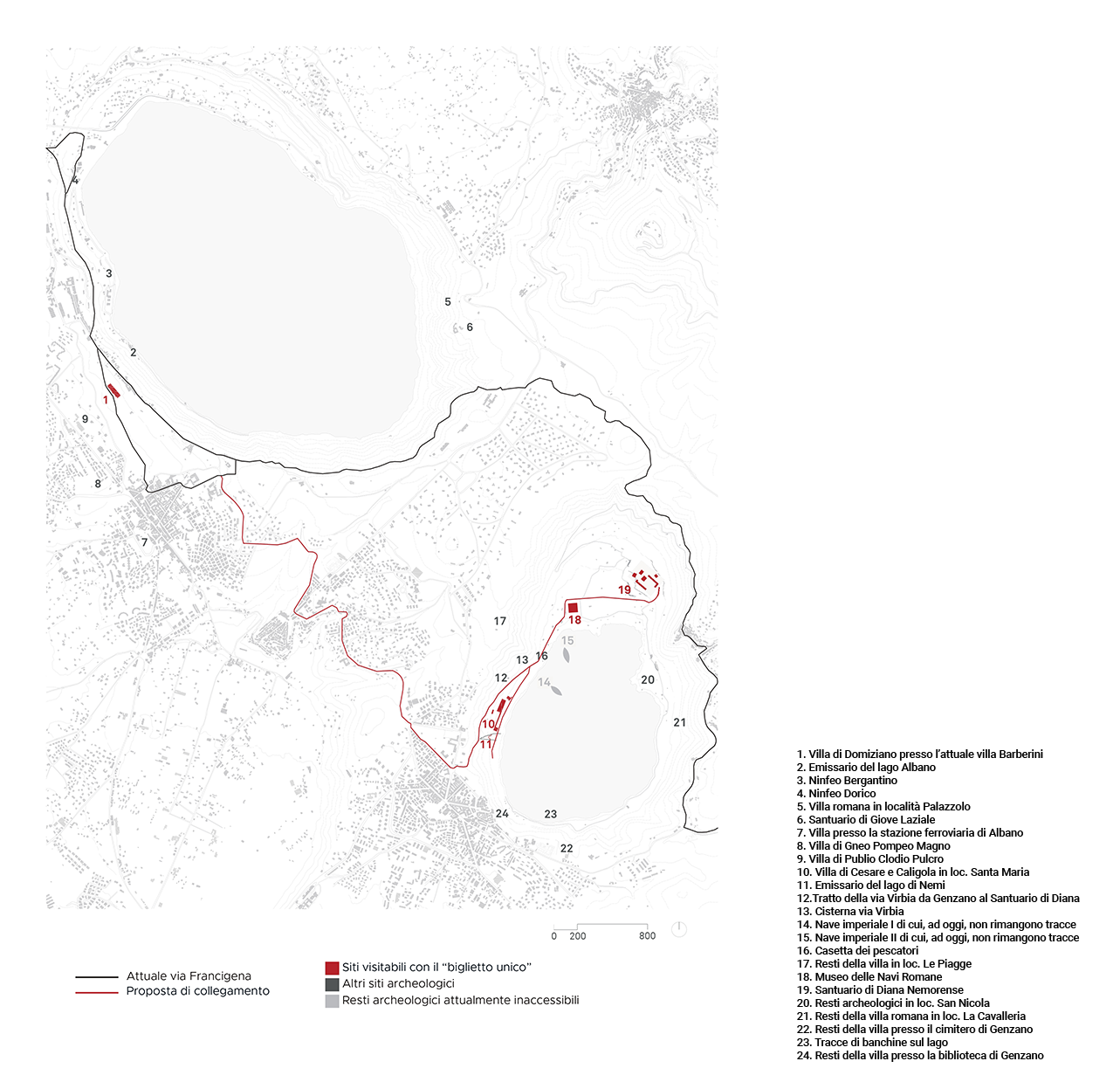 Tale divario ha suggerito l’ideazione di una proposta di visita per valorizzare e rendere accessibili entrambe le ville imperiali affacciate sul lago di Nemi e sul lago di Albano [Fig. 8]: il cammino diventerebbe un’esperienza immersiva a partire da due luoghi separati in pianta ma che si qualificano come l'esito di un'unica propaganda del potere. In entrambi i contesti, infatti, le due ville imperiali non sono solo due complessi architettonici, ma simboli di un’epoca in cui il potere degli imperatori si manifestava attraverso il controllo del paesaggio e la costruzione di spazi di rappresentanza. Riconoscere e valorizzare il loro legame può dunque contribuire a una maggiore comprensione della storia romana e delle sue architetture, arricchendo l'esperienza dei visitatori e preservando il patrimonio culturale.