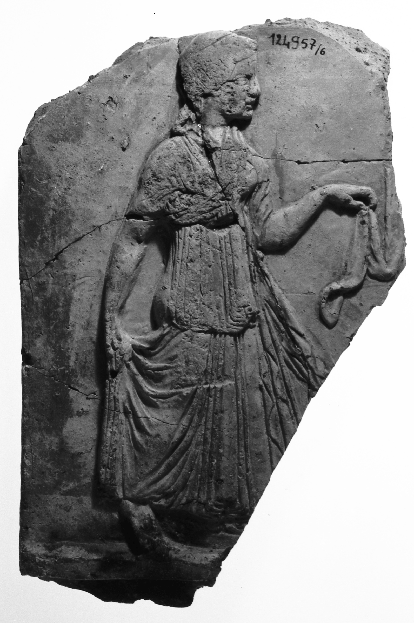 13 |Frammento di lastra fittile con due korai ai lati di un candelabro, 1979 (Su concessione del Ministero della Cultura - Museo Nazionale Romano, Archivio Fotografico MNR, INVN 115034).
