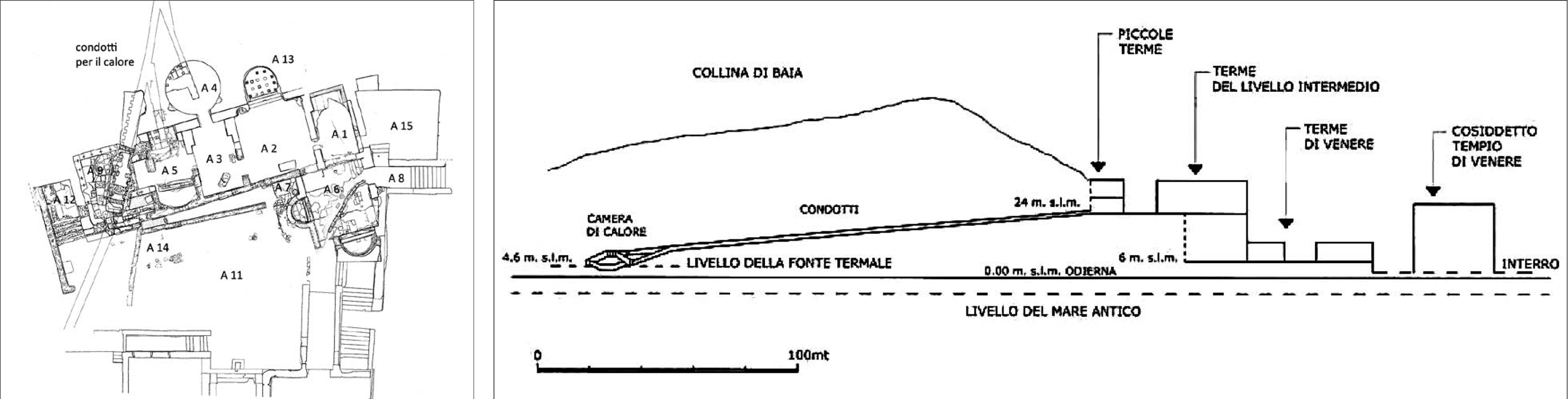 2 | Plan and section of the “Le Piccole Terme” bathing establishment, which exploited the healing springs at Baia (Medri 2013, 122, fig. 3).
