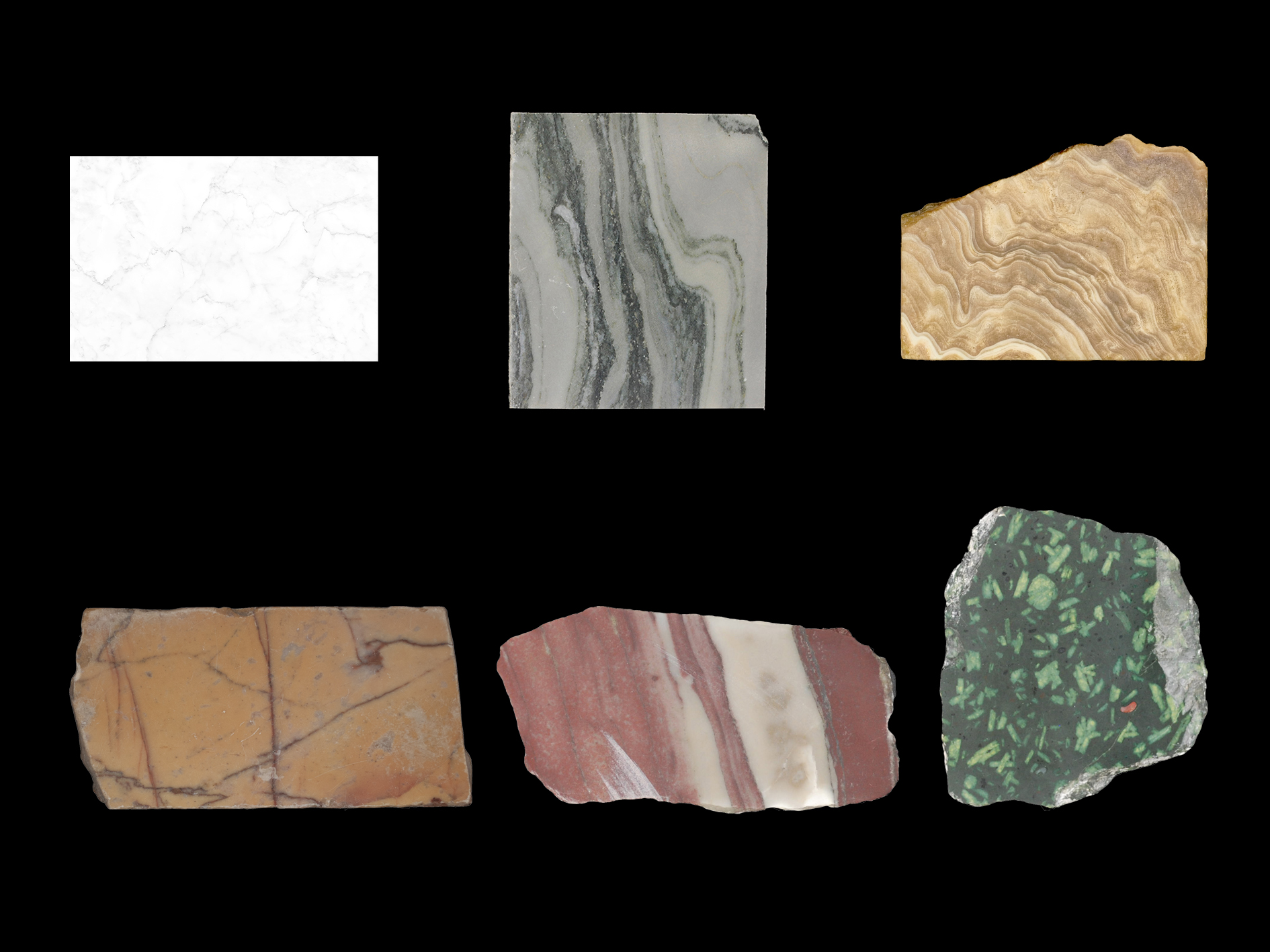 5 | Ancient marbles mentioned in the literary sources analysed: 1. Thasian marble; 2. Carystian marble or cipollino verde; 3. alabastro cotognino; 4. giallo antico; 5. cipollino rosso; 6. porfido verde (graphic design by the author, photos of the marble present in the Laboratorio di Analisi di Materiali Antichi, Iuav University of Venice).