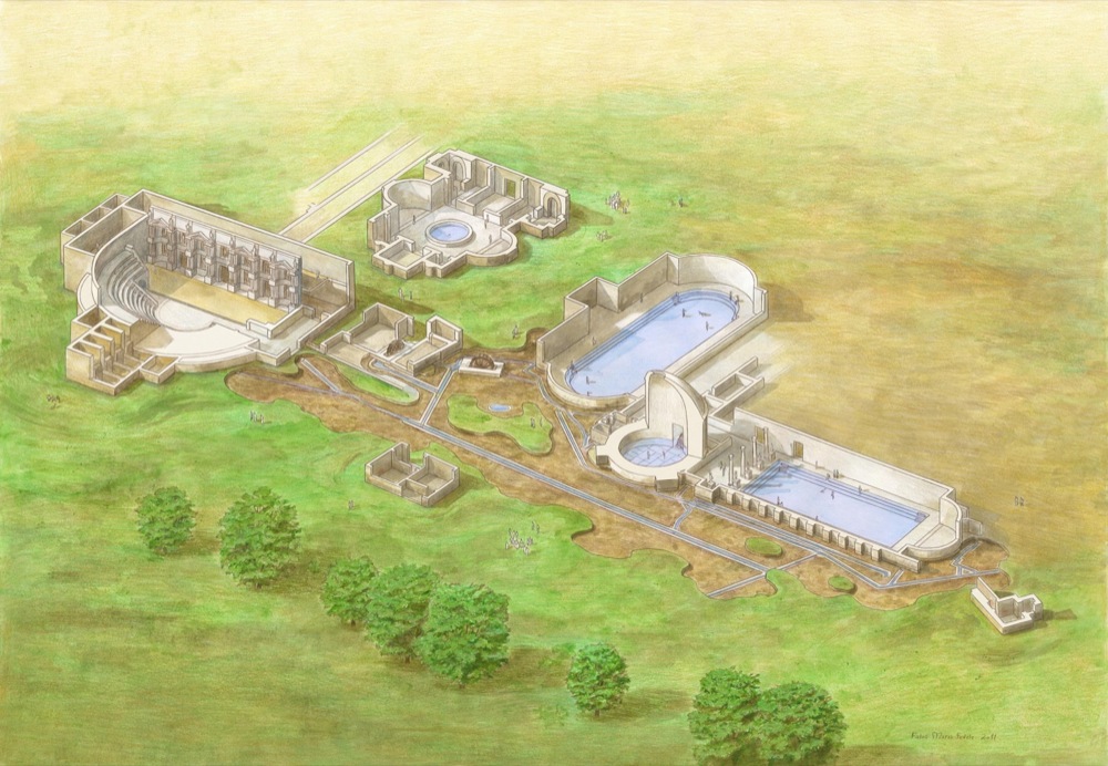 1 | Hypothetical reconstruction of the Roman Thermal Park at Montegrotto Terme (PD), showing the three main pools, the covered circular pool, the theatre/odeum, palaestrae, and water-lifting norias. Reconstruction based on archaeological evidence and surveys conducted by SABAP – Soprintendenza Archeologia, Belle Arti e Paesaggio of Padua.