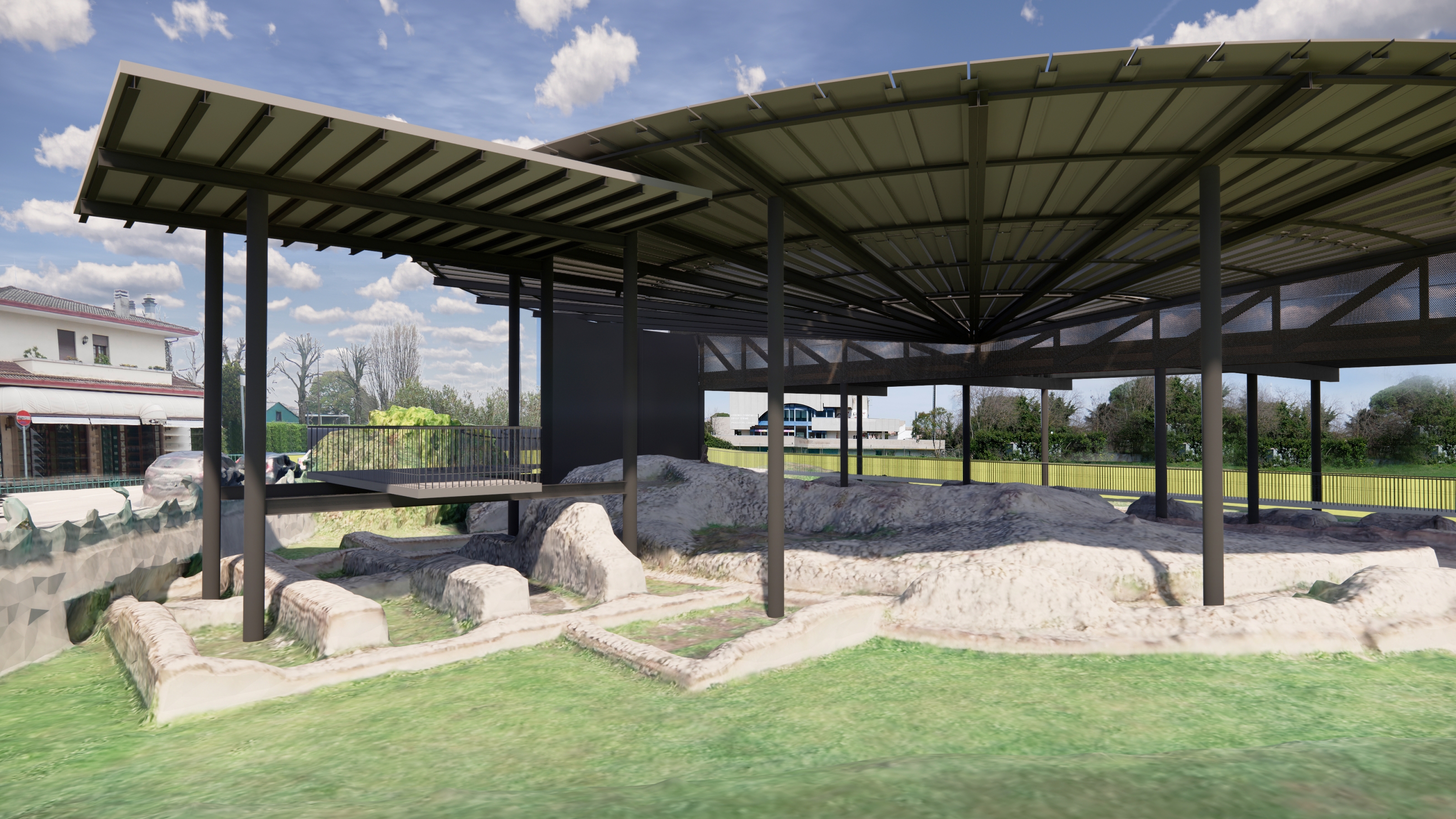 The contribution illustrates the new, comprehensive project for the conservation and enhancement of the archaeological area of Via Scavi in Montegrotto Terme, made possible through dedicated funding allocated by the Ministry of Culture within Italy’s 2021-2023 public works programme. The intervention addresses structural vulnerabilities, the deteriorated protective systems, and the critical relationship between the archaeological park and the adjacent Viale della Stazione – one of the main urban thoroughfares. The proposed design redefines access points, introduces new visitor facilities, and creates a coherent, museum-like circulation system using sustainable materials. A major feature is the new permanent roof over the odeum, conceived as a contemporary velarium that ensures both protection and interpretative clarity while enabling elevated internal walkways and small-scale cultural events. The project also includes landscaped areas inspired by archaeobotanical evidence and geomorphological studies, evoking the ancient thermal and marshy environment of Montegrotto. Overall, the intervention aims to restore legibility, accessibility, and urban connectivity, offering a renewed framework for the public enjoyment and long-term preservation of this unique thermal heritage site.